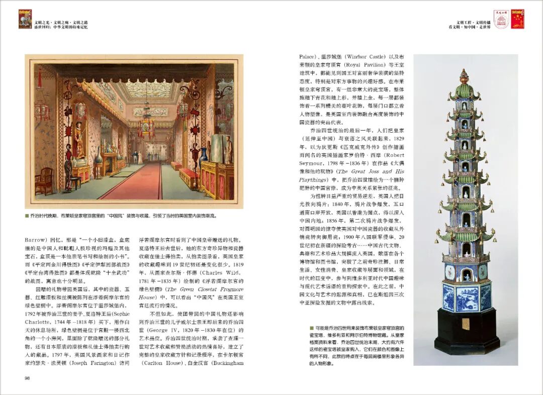 使团带回的中国礼物还影响到乔治三世的儿子威尔士亲王即后来的乔治四世的艺术品位。乔治四世统治时期,承袭了查理一世对艺术收藏和赞助活动的热情喜好,建立了完整的皇家收藏方针和记录程序,在卡尔顿、白金汉宫、温莎城堡以及布莱顿的皇家穹顶宫等王室建筑中,都能见到国王对富丽奢华装潢的坚持态度,特别是对东方事物的兴趣好感。在布莱顿皇家穹顶宫,有一组非常大的瓷宝塔,整体施釉下青花和釉上彩,并描上金,每一层都装饰着一系列精美的蔓叶花饰,每层门口都立着人物塑像,是英国室内装饰融合高度装饰的中国瓷器的突出代表。