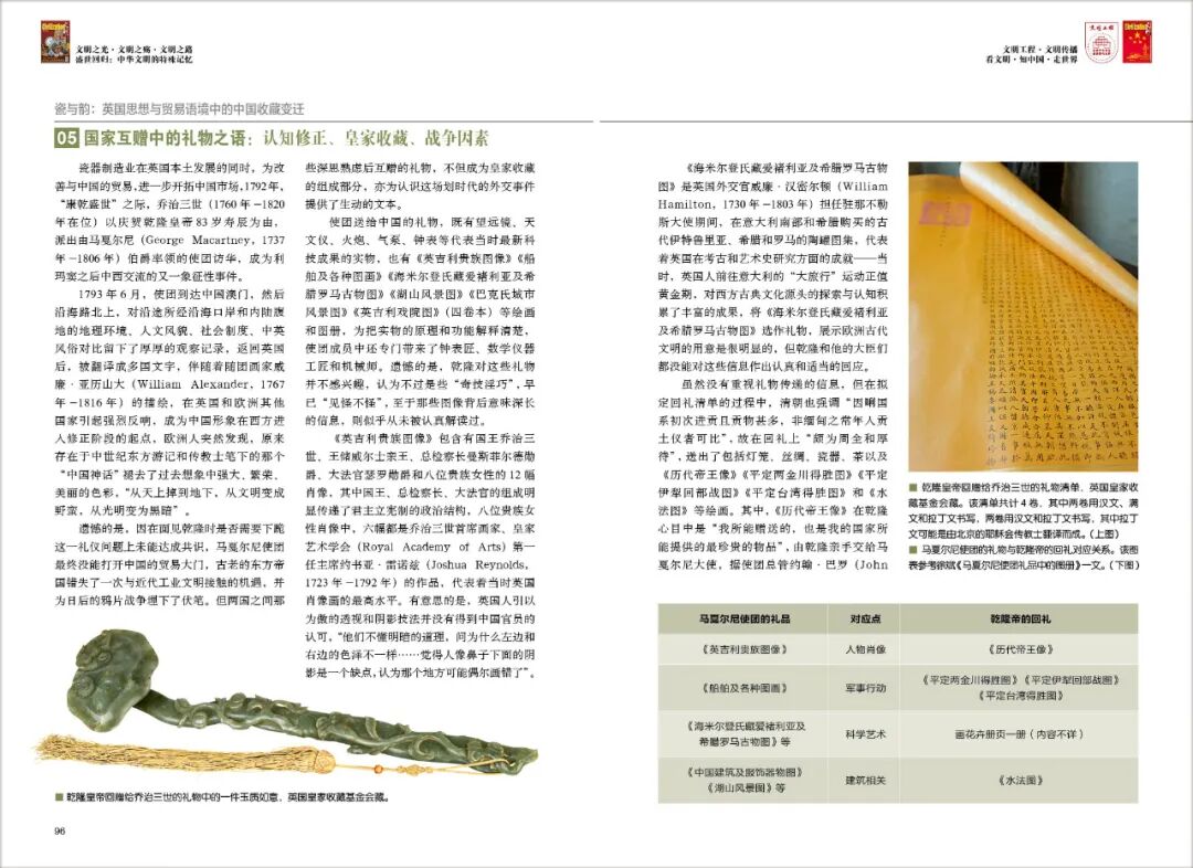 使团送给中国的礼物,既有望远镜、天文仪、火炮、气泵、钟表等代表当时最新科技成果的实物,也有《英吉利贵族图像》《船舶及各种图画》《海米尔登氏藏爱褚利亚及希腊罗马古物图》《湖山风景图》《巴克氏城市风景图》《英吉利戏院图》(四卷本)等绘画和图册,为把实物的原理和功能解释清楚,使团成员中还专门带来了钟表匠、数学仪器工匠和机械师。遗憾的是,乾隆对这些礼物并不感兴趣。