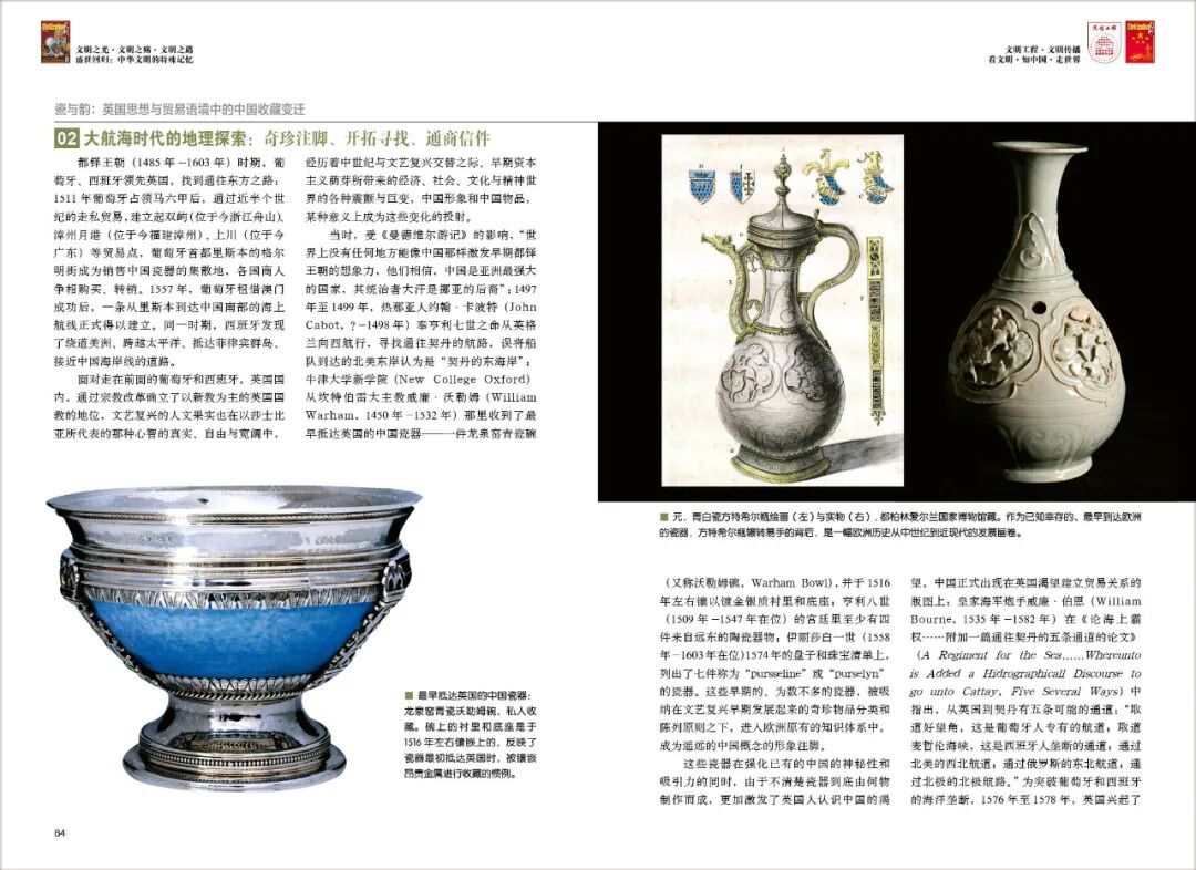 当时,受《曼德维尔游记》的影响,“世界上没有任何地方能像中国那样激发早期都铎王朝的想象力,他们相信,中国是亚洲最强大的国家,其统治者大汗是挪亚的后裔”:1497年至1499年,热那亚人约翰·卡波特奉亨利七世之命从英格兰向西航行,寻找通往契丹的航路,误将船队到达的北美东岸认为是“契丹的东海岸”;牛津大学新学院从坎特伯雷大主教威廉·沃勒姆那里收到了最早抵达英国的中国瓷器——一件龙泉窑青瓷碗,并于1516年左右镶以镀金银质衬里和底座;亨利八世的宫廷里至少有四件来自远东的陶瓷器物;伊丽莎白一世1574年的盘子和珠宝清单上,列出了七件称为“pursseline”或“purselyn”的瓷器。