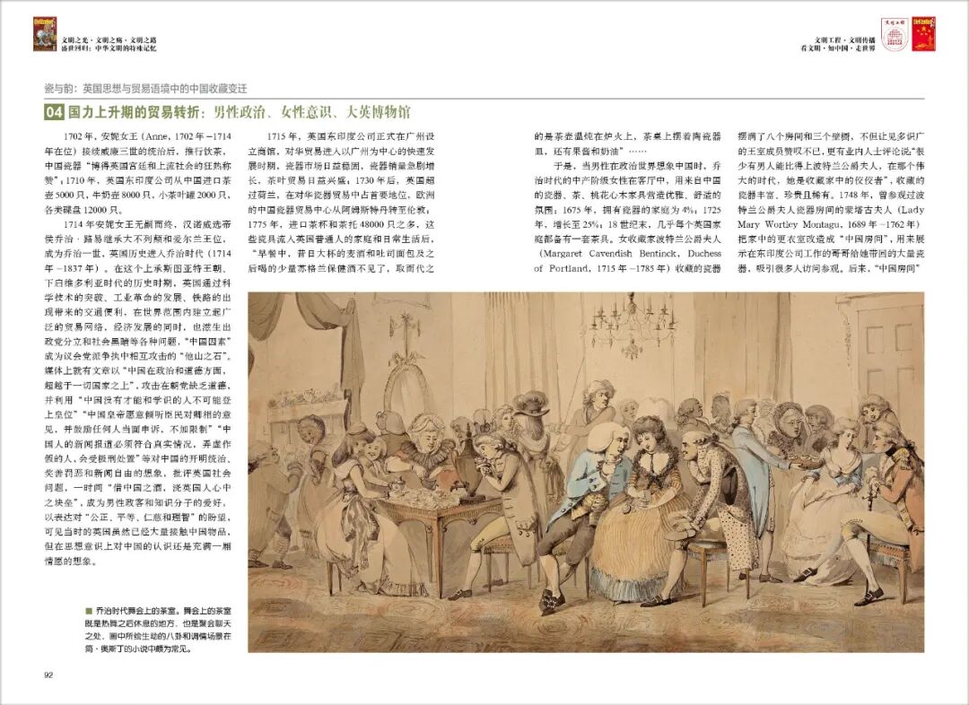18世纪末,几乎每个英国家庭都备有一套茶具。女收藏家波特兰公爵夫人收藏的瓷器摆满了八个房间和三个壁橱,收藏的瓷器丰富、珍贵且稀有。1748年,曾参观过波特兰公爵夫人瓷器房间的蒙塔古夫人把家中的更衣室改造成“中国房间”,用来展示在东印度公司工作的哥哥给她带回的大量瓷器,吸引很多人访问参观。后来,“中国房间”成为蒙塔古夫人和女作家们一起聚会、学习、讨论问题的地方,见证着中国瓷器文化对英国女性在审美、情感、社交、职业等主体意识形成过程中的影响。