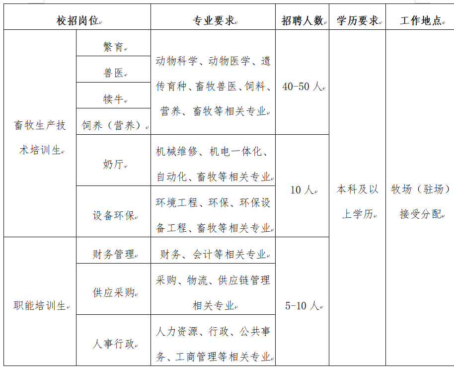 公司秉承“以人为本、以牛为中心、以业绩为导向”的经营方针,优先选择喜欢奶牛、热爱养牛事业、能亲身一线、励志于行业长期发展的优秀毕业生!
