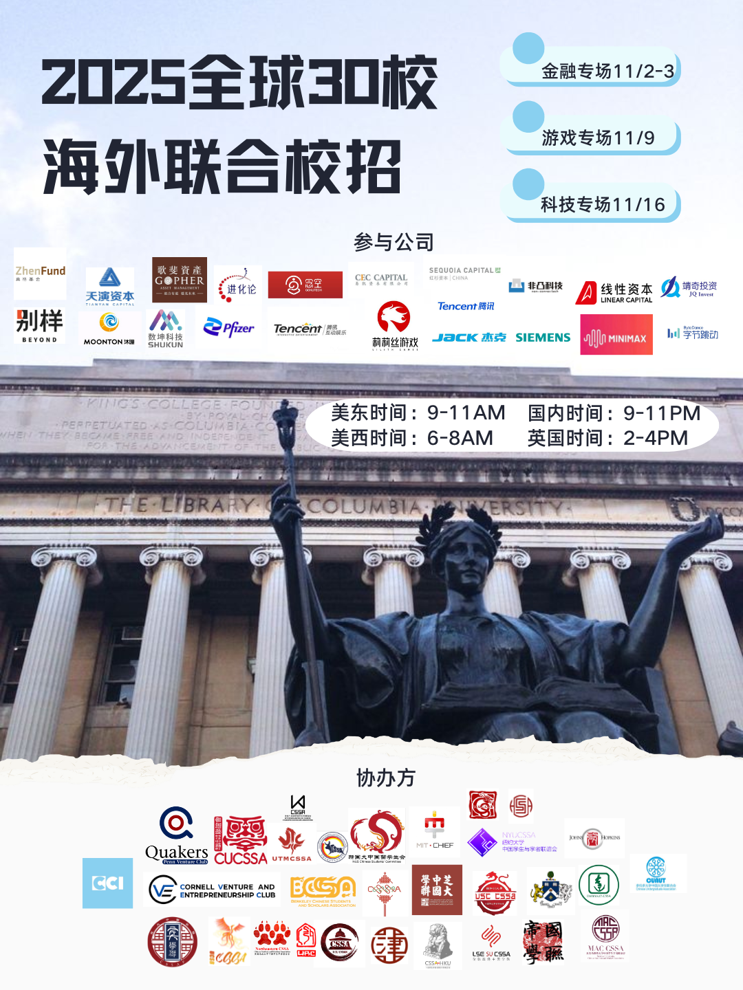 为协助国内外企业提升品牌国际影响力,同时为帮助留学生提升海内外求职竞争力,英国及北美地区十余所高校诚挚邀请海内外金融机构、国央企、外企和上市公司等伙伴展开合作,针对世界排名前100的海外高校组织线上校园招聘活动(留学生专场)