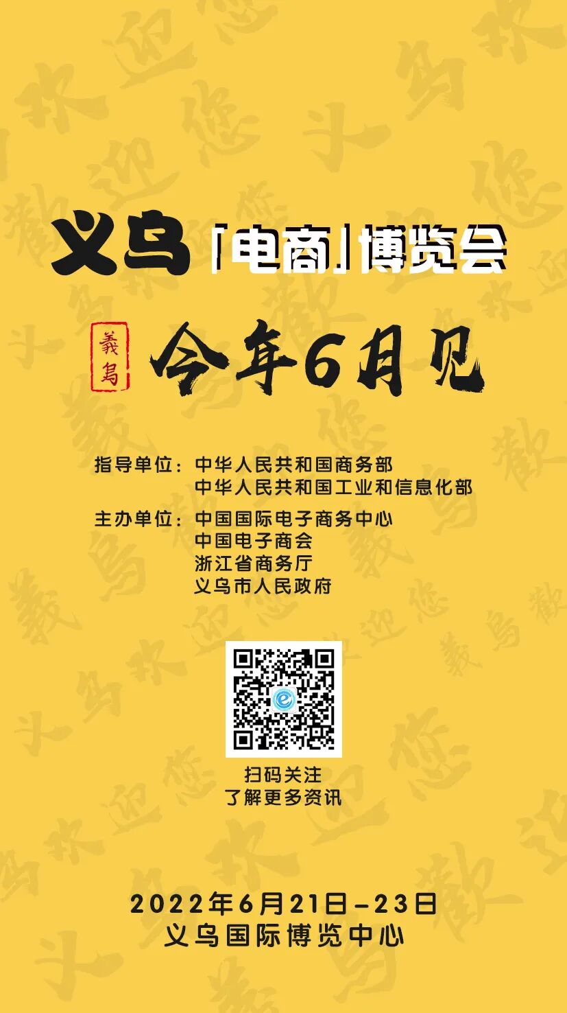 鉴于当前全国疫情防控形势,为贯彻落实中央和浙江省政府做好新型冠状病毒肺炎的疫情防控工作,切实保障参展商与参观观众生命健康及切身利益。组委会研究决定,原定于“2022年4月11-13日”在义乌国际博览中心举办的“2022中国国际电子商务博览会”延期至2022年6月21-23日举办,地点不变。