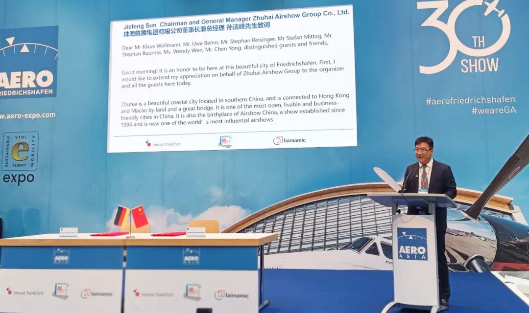 孙洁峰董事长在致辞中表示,珠海航展集团作为中国航展的承办单位已连续成功举办了十四届中国航展,是国内最具影响力的航空航天组展企业,为促进航空航天科技发展,推动国际商贸交流合作做出重要贡献。2023年首届亚洲通航展在珠海国际航展中心成功举办,其展览规模、质量和影响力远超预期,为亚洲地区乃至全球全新开拓了一个国际化、专业化的通航品牌展会。法兰克福展览集团是世界顶尖的会展公司,在全球拥有完善的业务网络、丰富的会展资源和先进的管理经验。双方将充分发挥各自品牌优势,进一步整合资源、开拓思路,共推亚洲通航展朝着“国际化、专业化、品牌化”发展目标阔步迈进,共促全球通用航空产业和低空经济持续健康发展。同时,双方将以成立合资公司为契机,依托中国庞大的市场,并结合珠海优美的城市环境和良好的产业政策,积极引进和培育更多境内外品牌展会活动,推动珠海及粤港澳大湾区会展业繁荣发展。