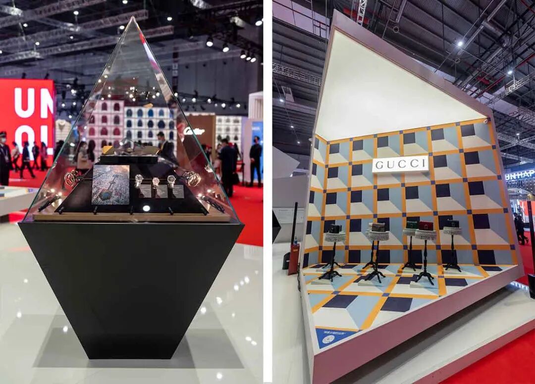 此次展厅以浪漫柔和的玫瑰色为主色调,轻轻升高的平台上矗立着水晶般的棱柱立方体,展示着来自开云 12 个标志性的品牌的匠心精品。
