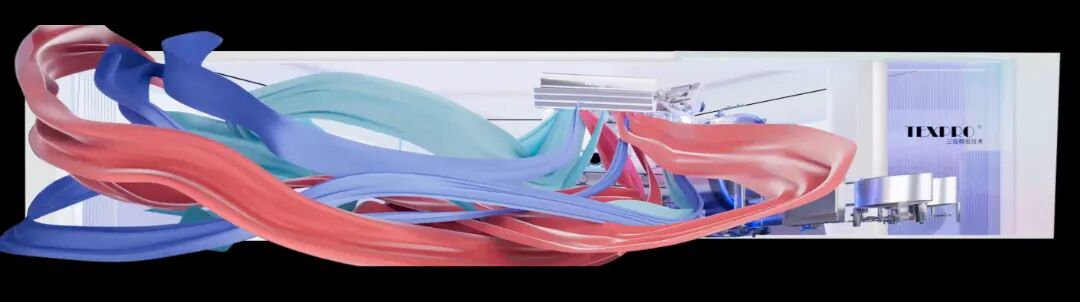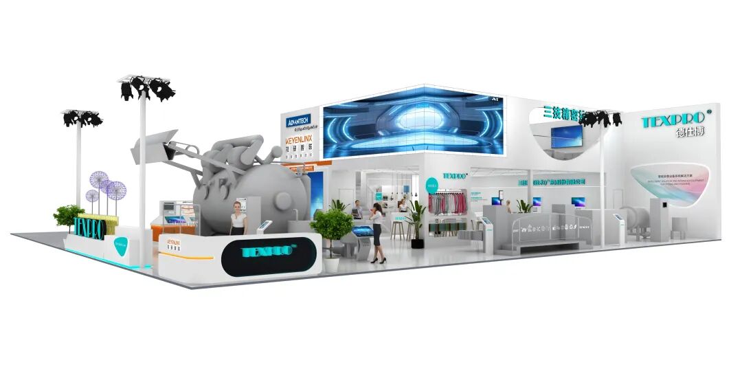 设置飞屏交互、智能摆布系统等多个数字化交互体验区,从数字化设备、数字化工艺与数字化解决方案全方位展示三技精密对数字化染厂系统的积极布局。