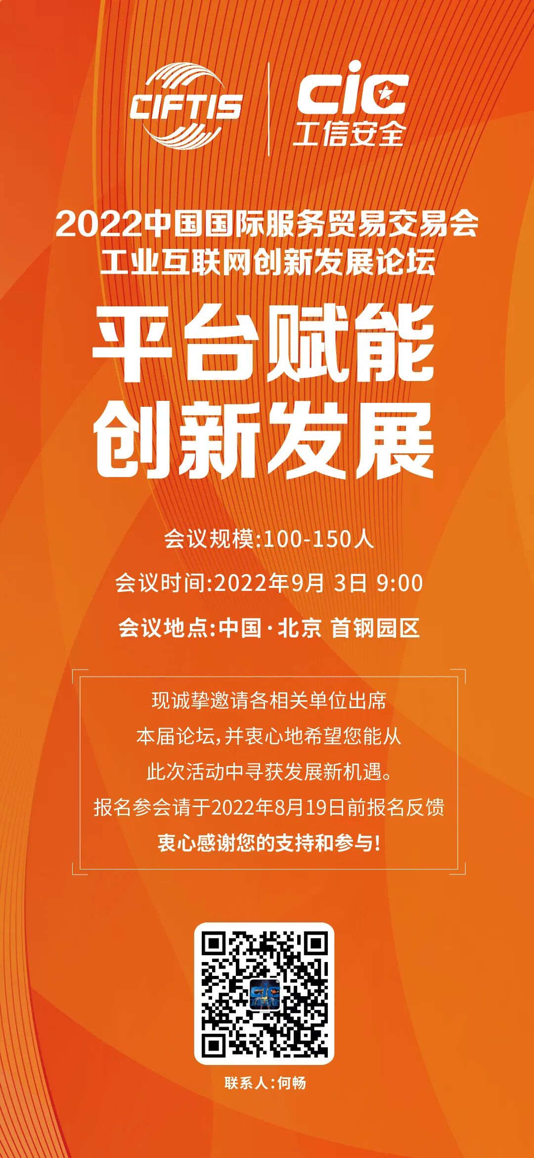 1 | 会议主题:平台赋能 创新发展 会议性质:线下会议 会议规模:100-150人 会议时间:2022年9月3日 9:00-12:00 会议地点:中国·北京 首钢园区服贸会8号馆东侧缓冲间多功能厅001 |