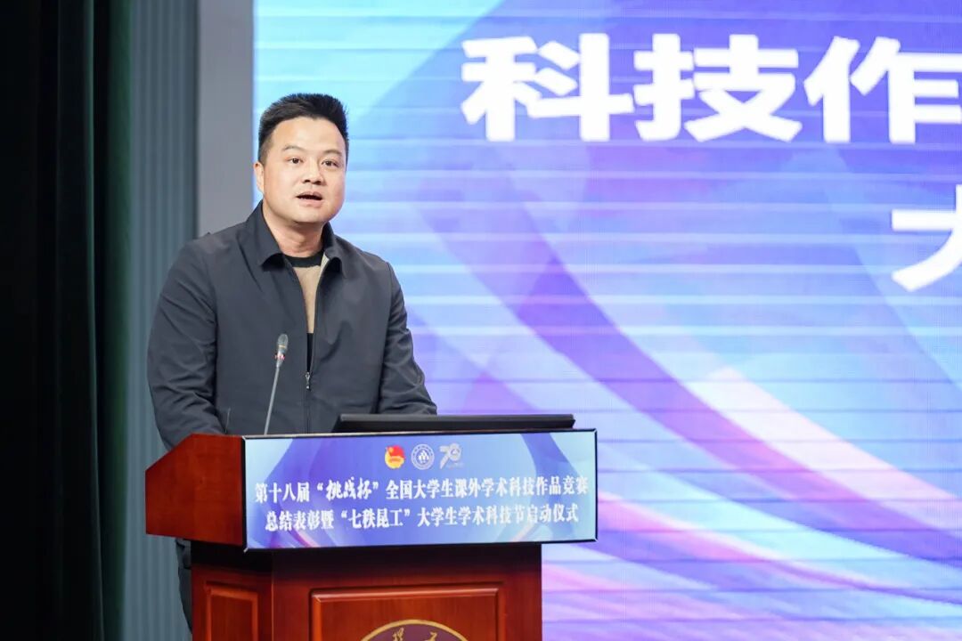 昆明理工大学第十八届“挑战杯”全国大学生课外学术科技作品竞赛总结表彰暨“七秩昆工”大学生学术科技节启动仪式在呈贡校区公教楼小剧场举行。共青团云南省委副书记段胜忠和校领导唐家华、王华、易健宏、陶光荣、潘学军、潘波、刘殿文出席活动并为获奖项目师生颁奖,蔡金红主持活动。
