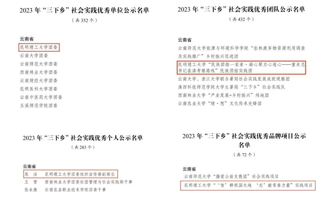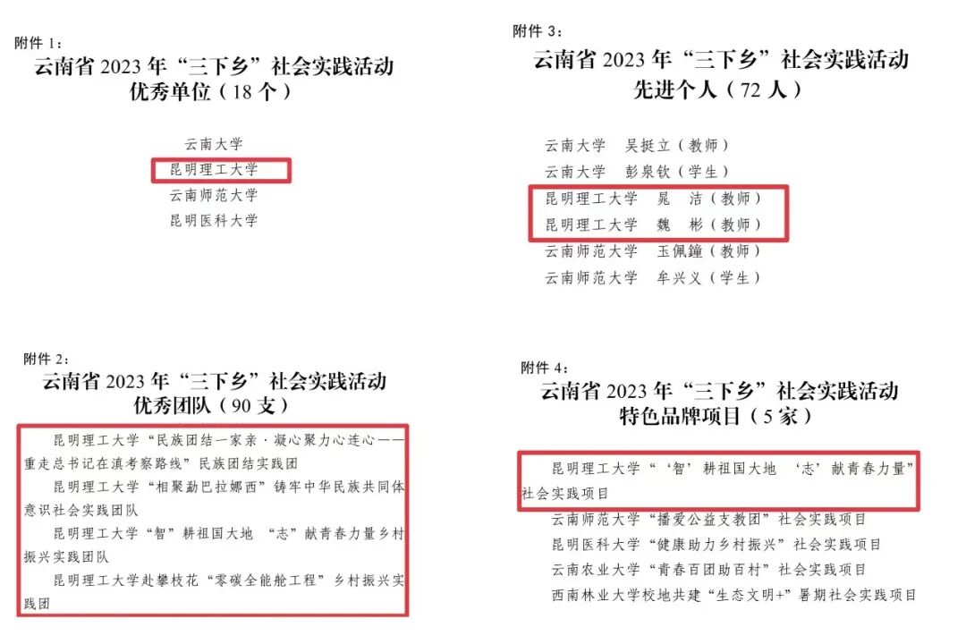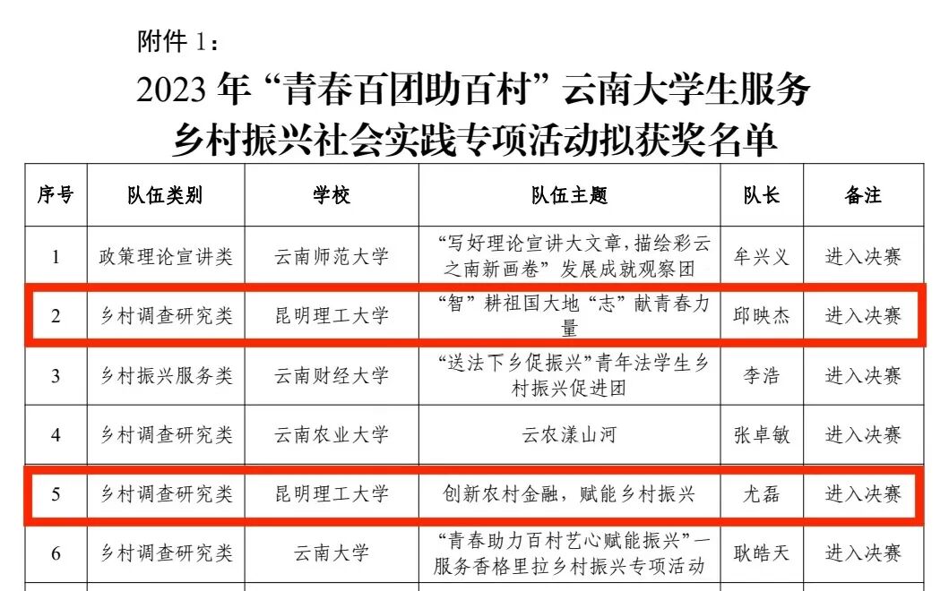 学校机电工程学院“‘智’耕祖国大地 ‘志’献青春力量”乡村振兴实践团、管理与经济学院“创新农村金融,赋能乡村振兴”乡村振兴实践团在2023年“青春百团助百村”云南大学生服务乡村振兴社会实践专项活动中分别荣获省级一等奖和二等奖。