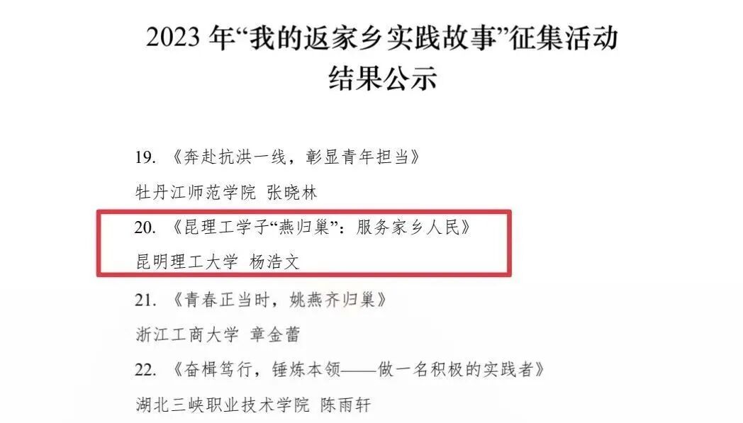 我校国土资源工程学院杨浩文同学在2023年“我的返家乡社会实践故事”中获评“优秀作品”。