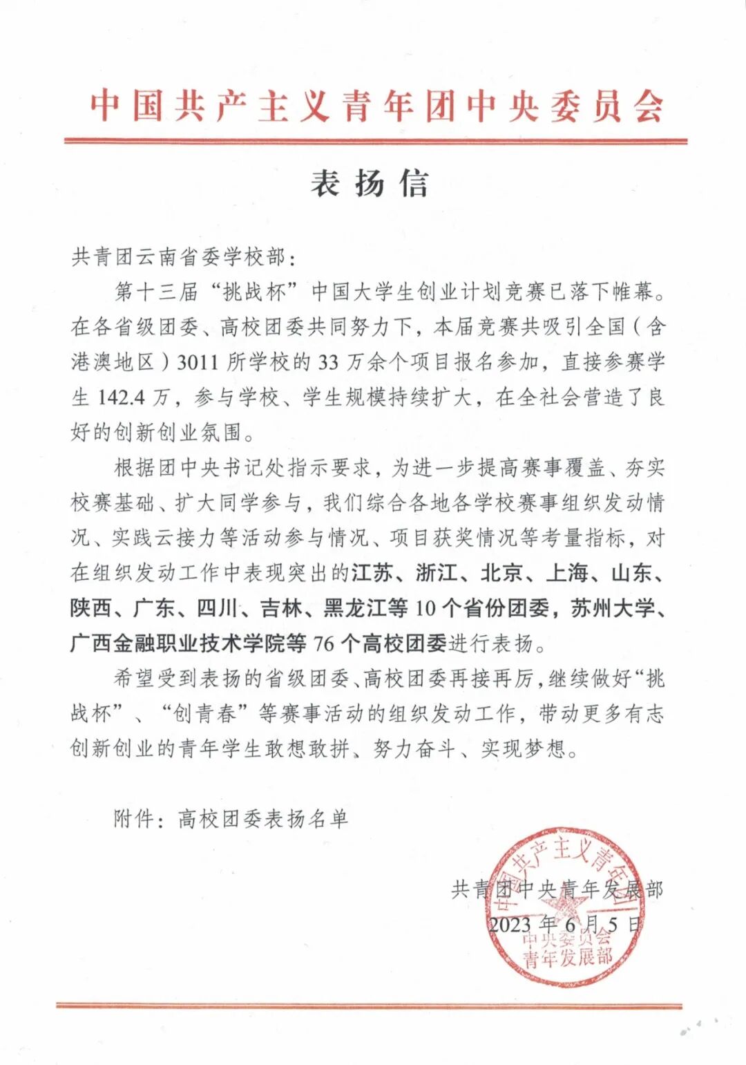 驻足回望,2023年是学校共青团不断攀登的一年。在第十八届“挑战杯”全国大学生课外学术科技作品竞赛中获国家级奖项17项,获奖级别和数量位列全省高校第一,首次获主体赛特等奖,是云南省高校获得的唯一一项特等奖,更是“挑战杯”竞赛34年以来云南省首次获得自然科学类学术论文特等奖。获第十三届“挑战杯”中国大学生创业计划竞赛金奖1项,实现了我校在该赛事上金奖“零”的突破,也是云南省高校近11年来唯一金奖。连续七年获全国大中专学生暑期“三下乡”社会实践活动优秀单位,共获得社会实践等国家级奖项40项、省级奖项10项。5名师生获评2023年“云南创新之星”,占授奖总数的一半,数量位居全省之首。在云南省第七届大学生艺术展演活动中荣获一等奖14项,创造学校参加该项活动的历史最好成绩。涌现出共青团十九大代表、团中央“青春心向党 奋进新征程”示范宣讲团成员(云南省唯一)、“全国活力团支部”“全国优秀共青团员”“中国大学生自强之星”“中国电信奖学金”“云南省青年文明号”“云南青年五四奖章”等一大批先进集体和个人.....这些时光斑驳岁月里镌刻下的熠熠生辉的印记,无不凝结着我们每一个人的不懈奋斗。