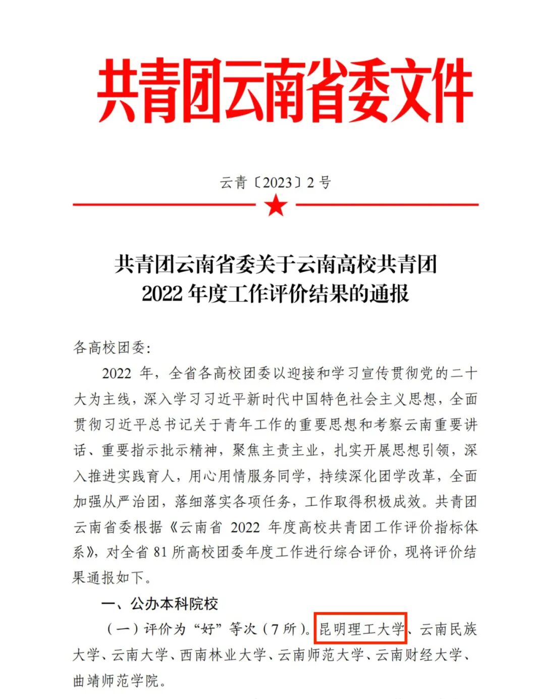 共青团云南省委公布云南高校共青团2022年度工作评价结果,学校共青团获评“好”等次。