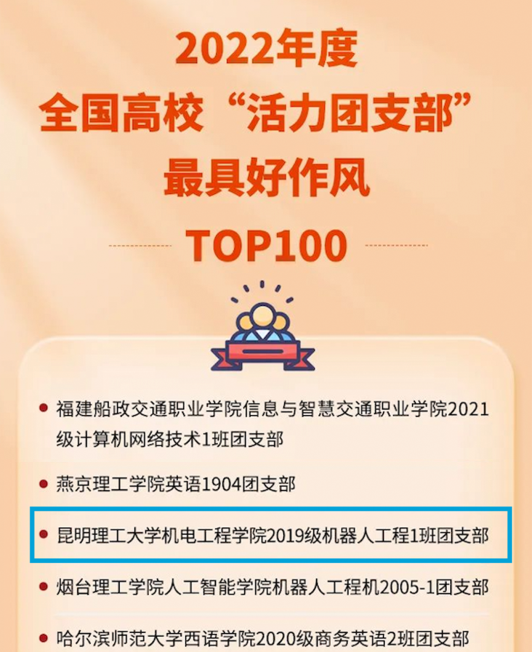学校机电工程学院2019级机器人工程1班团支部入围2022年度高校“活力团支部”风采展示活动最具好作风TOP100榜。