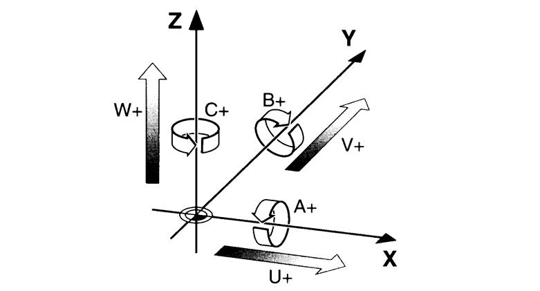 根据ISO的规定,在描述数控机床的运动时,采用左手直角坐标系;其中平行于主轴的坐标轴定义为Z轴,绕X、Y、Z轴的旋转坐标分别为A、B、C。通常五轴联动是指X、Y、Z、A、B中任意5个坐标的线性插补运动。