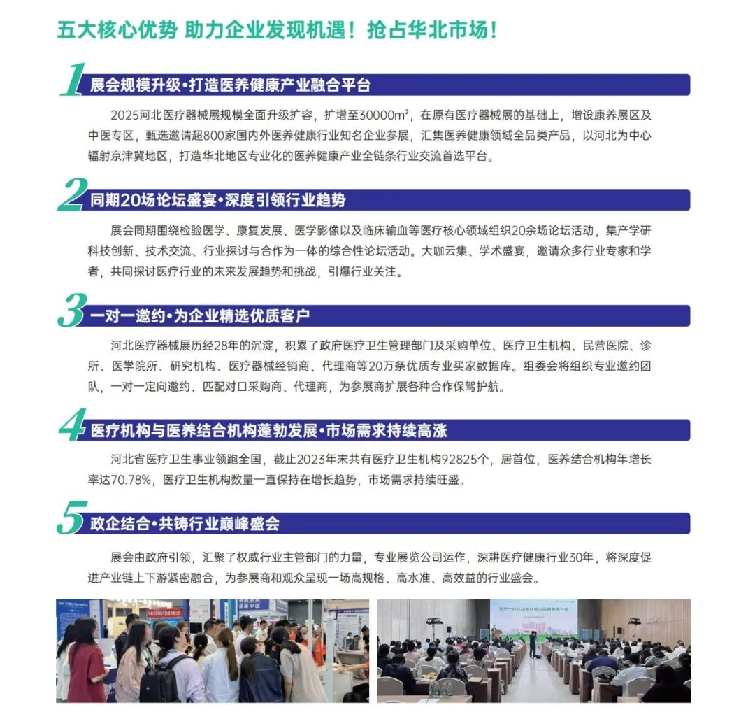 河北国际医疗器械展览会以“创新医疗科技,引领未来健康”为主题,于2025年2月20日-22日石家庄国际会展中心举办,拥有30000平方米的展示面积,汇聚国内外800家医疗器械领域的精英企业。展会致力于构建华北地区专业化的医疗器械产业全链条行业交流平台,为河北医疗健康产业发展贡献力量,旨在通过展示最新医疗科技成果,促进行业交流合作,推动医疗科技的创新发展。