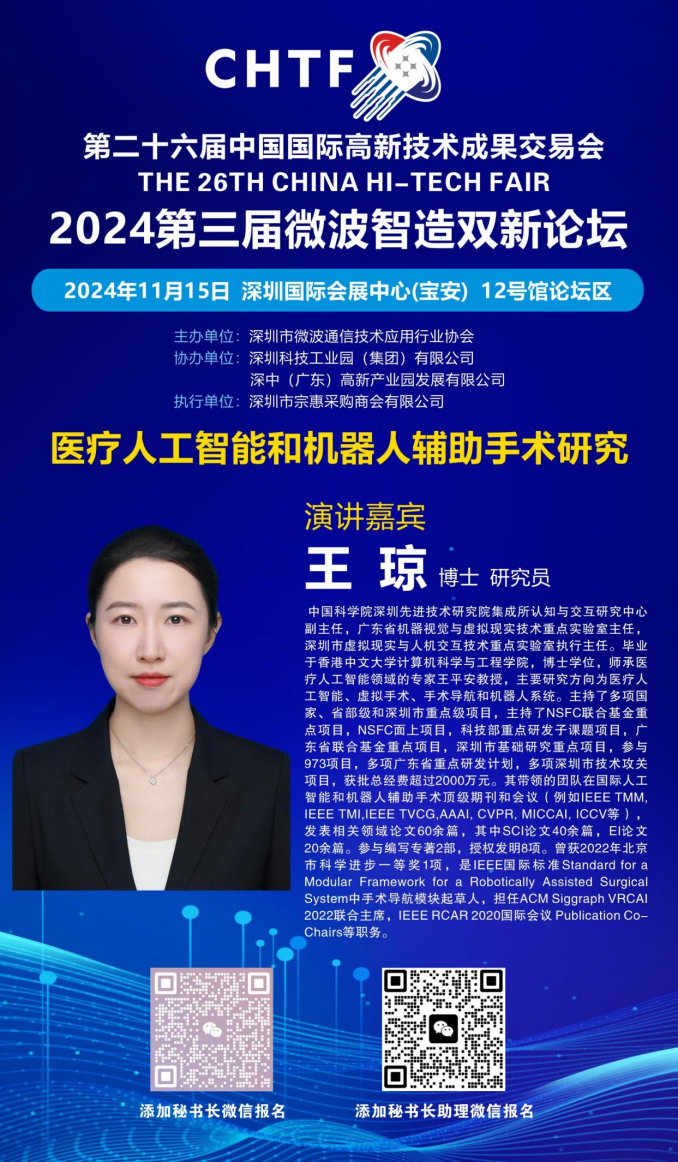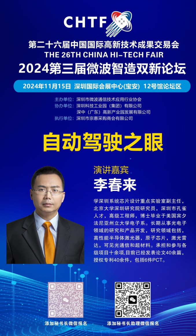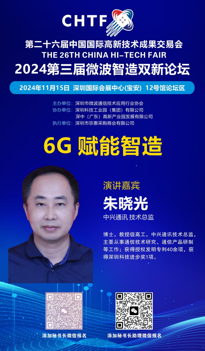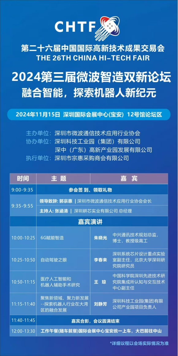 由深圳市微波通信技术应用行业协会主办,深圳科技工业园(集团)有限公司和深中(广东)高新产业园发展有限公司协办的:第二十六届中国国际高新技术成果交易会-2024第三届微波智造双新论坛2024年11月15日上午演讲主题及专家阵容公布: