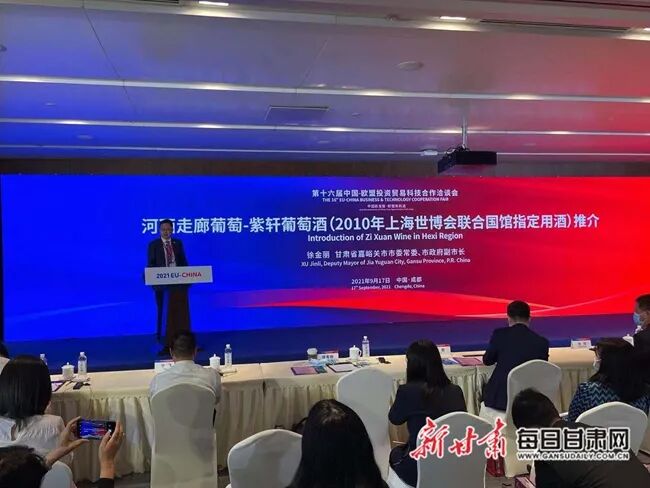 新甘肃客户端讯(新甘肃·每日甘肃网记者 杨红丽)第十八届中国西部国际博览会近日在四川成都举办,作为第十八届中国西部国际博览会主体活动之一,第十六届中国-欧盟投资贸易科技合作洽谈会在成都高新区中国-欧洲中心正式开幕。大会上,嘉峪关市委常委、副市长徐金丽向来宾推介河西走廊地理标志代表产品——紫轩葡萄酒。