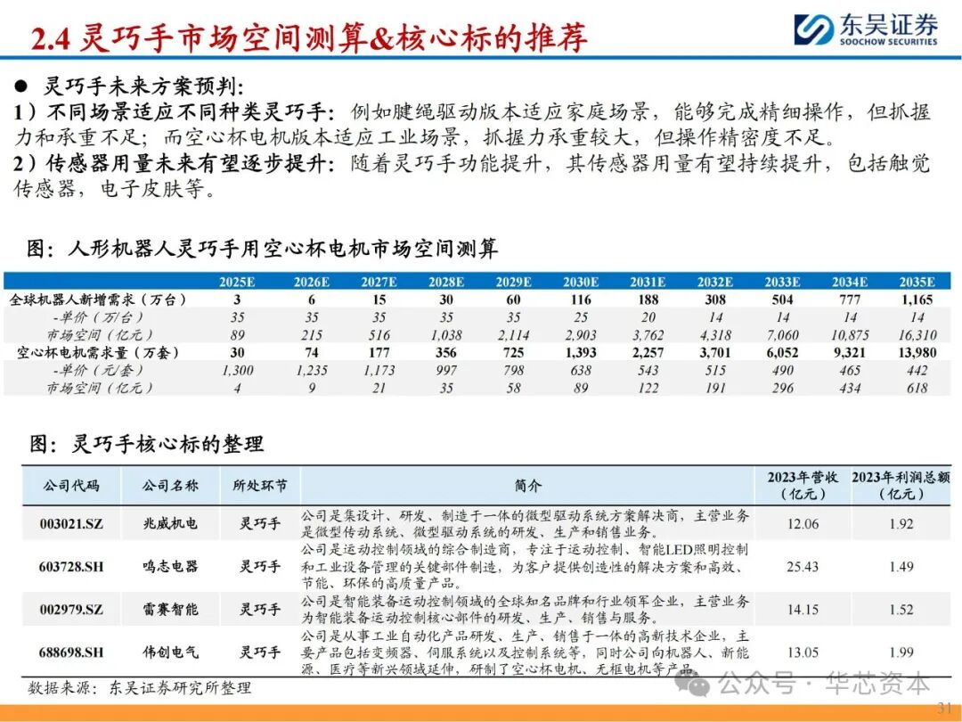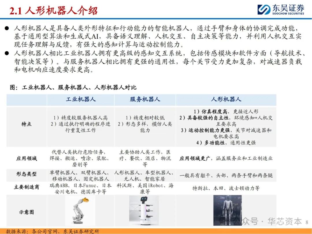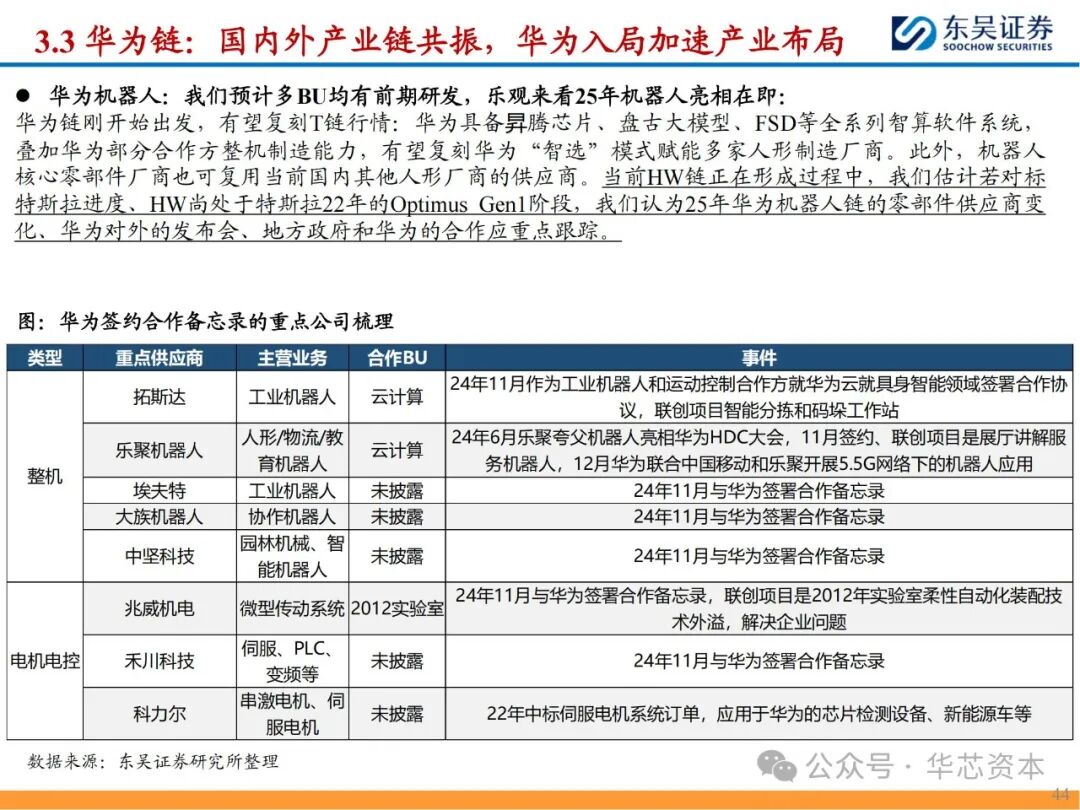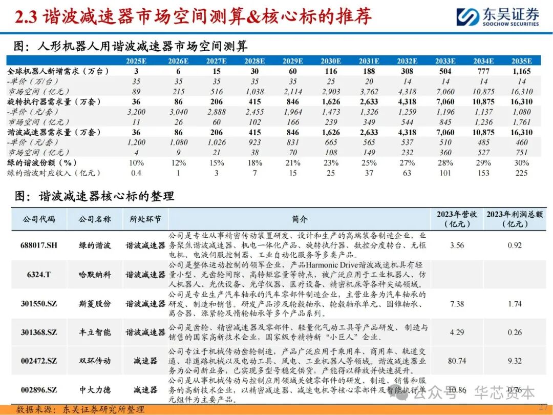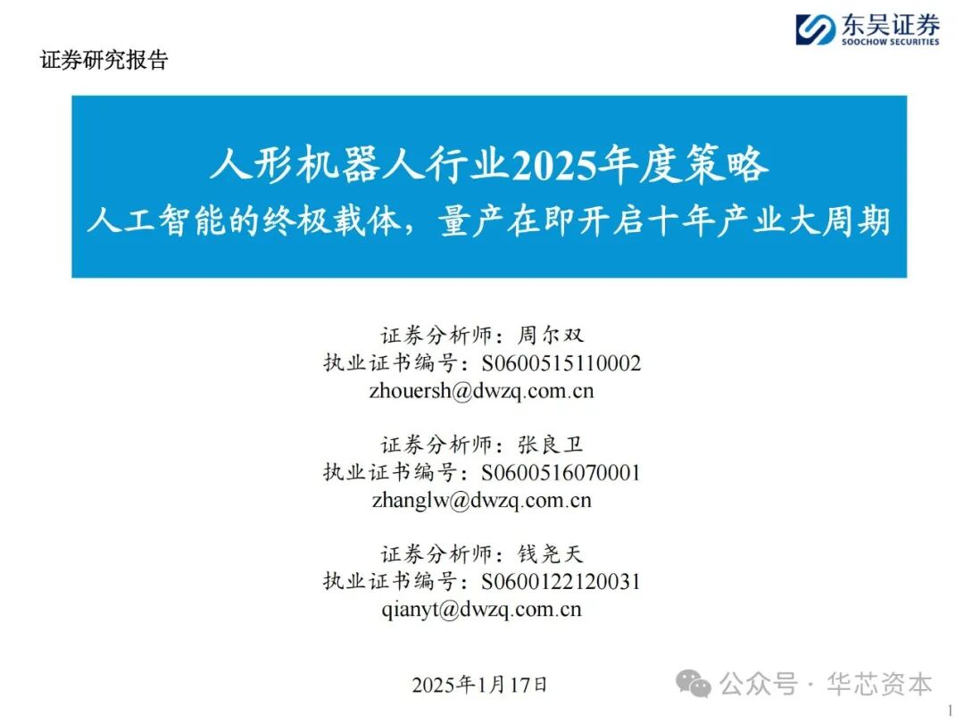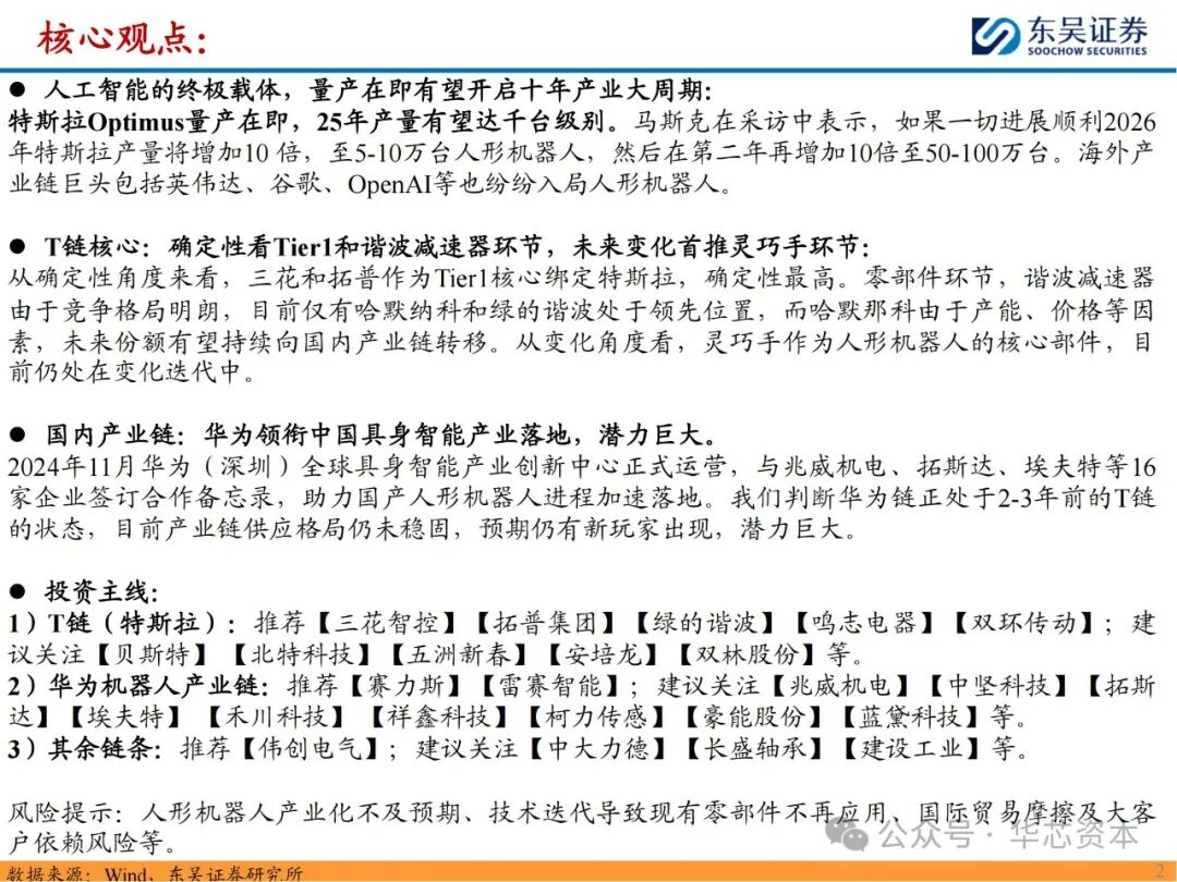 关注华芯资本公众号并发送“人形机器人”可获得PDF报告《人形机器人行业2025年度策略:人工智能的终极载体,量产在即开启十年产业大周期》。Q1:人形机器人行业当前的核心发展趋势是什么?A1:行业正迈向量产化与智能化新阶段,AI技术成为关键驱动力。1)量产化加速:特斯拉Optimus预计2025年产量达千台级别,2026年或增至5-10万台,2030年全球新能源汽车工厂需求或达50万台。2)AI赋能通用性:以ChatGPT为代表的端到端大模型技术,解决了人形机器人自主决策和环境适应的难题,使其从单一场景向通用场景突破。3)产业链分工明确:特斯拉(T链)和华为领衔国内产业链,核心零部件(如谐波减速器、灵巧手)成为竞争焦点。Q2:特斯拉Optimus的量产进展如何?哪些环节最具投资确定性?A2:特斯拉Optimus迭代迅速,硬件成熟度显著提升。量产规划:2025年产量预计达千台,2026年目标扩产至5-10万台,2027年或突破50万台。核心供应链:1)Tier1供应商:三花智控(热管理)、拓普集团(底盘结构)绑定特斯拉,确定性最高。2)谐波减速器:绿的谐波(国产龙头)和哈默纳科(日本巨头)占据主导,国产替代加速。3)灵巧手:短期内以外资为主,长期关注兆威机电、鸣志电器等国产替代机会。Q3:谐波减速器为何是人形机器人的关键技术?国产企业有何优势?A3:谐波减速器因体积小、精度高,成为人形机器人旋转关节的首选。1)技术难点:需解决棘轮效应、共振现象及减重问题,量产依赖工艺经验(如柔轮装配)。2)竞争格局:哈默纳科全球市占率38%,但扩产缓慢;绿的谐波(市占率26%)凭借成本优势(价格低30%)和快速扩产能力(目标产能100万台/年),有望抢占份额。3)国产替代逻辑:环保限制和人力成本使日本扩产困难,中国产业链成本低、响应快。Q4:华为如何布局人形机器人产业链?哪些领域值得关注?A4:华为以“大模型+算力”为核心,推动具身智能落地。技术布局:1)盘古大模型提供AI决策能力,异腾芯片支撑算力需求。2)与兆威机电(微型传动)、拓斯达(工业机器人)等16家企业合作,加速技术外溢。投资主线:1)整机制造:关注拓斯达、埃夫特等与华为联创的智能工作站项目。2)核心零部件:兆威机电(灵巧手传动)、禾川科技(伺服系统)有望受益。3)潜力场景:汽车工厂(质检/总装)、家庭服务(端茶倒水)为初期落地方向。Q5:人形机器人市场空间有多大?哪些应用场景将率先爆发?A5:汽车工厂是短期核心场景,长期向服务业扩展。市场测算:1)2030年特斯拉工厂需求12.5万台,全球新能源汽车工厂需求50万台。2)谐波减速器市场规模或达751亿元(2035年),灵巧手电机市场618亿元。场景优先级:1)汽车制造:总装环节自动化率仅10%,人形机器人可替代人工安装、质检。2)物流与零售:轮式机器人(成本低)优先切入C端配送、仓储管理。3)家庭服务:需等待AI交互和安全性技术成熟,预计2030年后放量。Q6:投资该行业需警惕哪些风险?A6:三大风险需重点关注:1)技术迭代风险:灵巧手、传感器等技术路线未定型,现有供应商可能被替代。2)量产不及预期:核心零部件(如行星滚柱丝杠)加工难度高,或拖累降本进度。3)地缘政治风险:中美贸易摩擦或影响芯片、精密部件供应链稳定性。结语人形机器人行业正处于“硬件迭代+AI突破”的关键节点,特斯拉与华为分别引领全球和国内产业链发展。投资者需聚焦高确定性环节(T链、谐波减速器),同时关注华为链的预期差机会。短期看汽车工厂落地,长期押注通用场景突破,但需警惕技术路径变化与国际局势波动带来的不确定性。/END/最近我们要组织一系列关于【AI、半导体、新材料】闭门会议,有兴趣的同学,非常欢迎和我们多多交流,互相探讨,一起成长(华芯资本梁东健,VX:sinbaliang)。