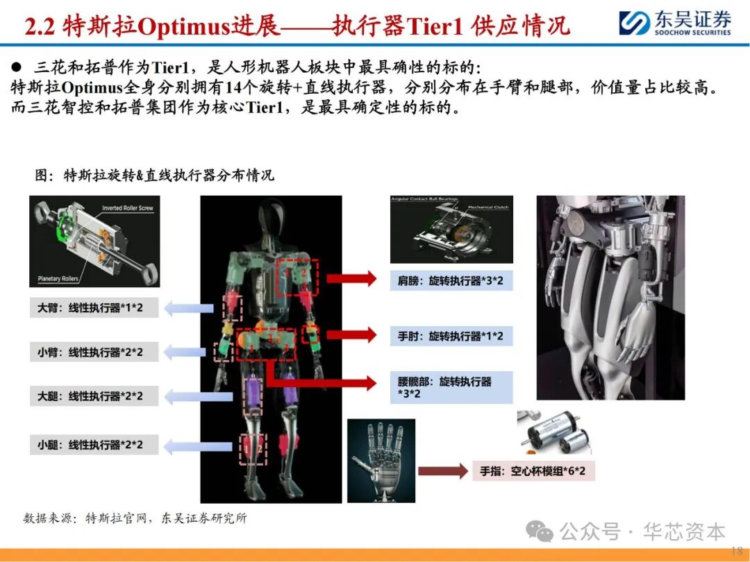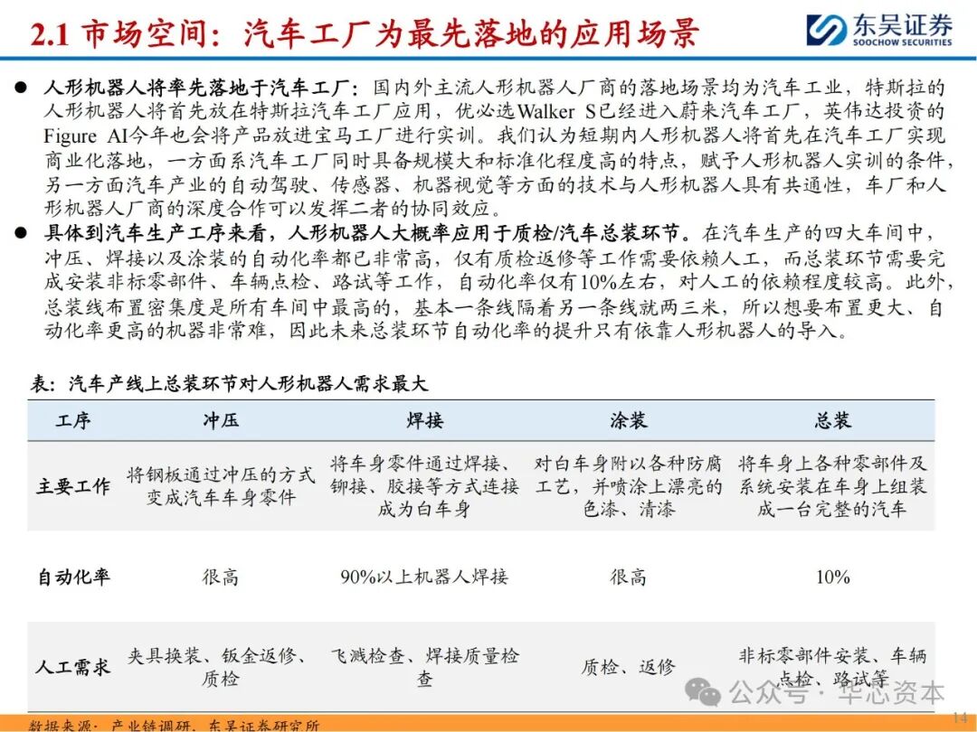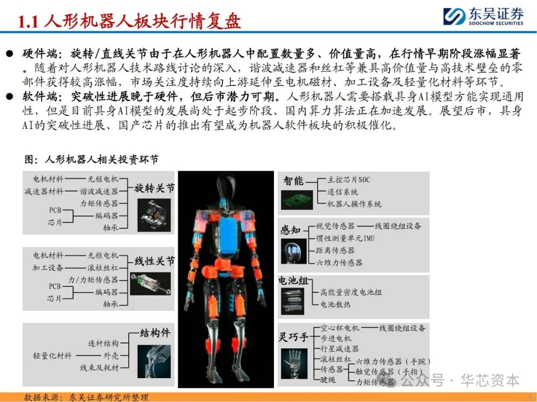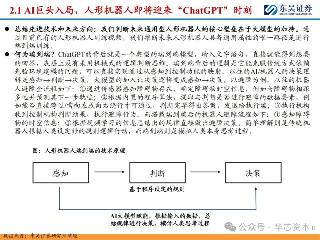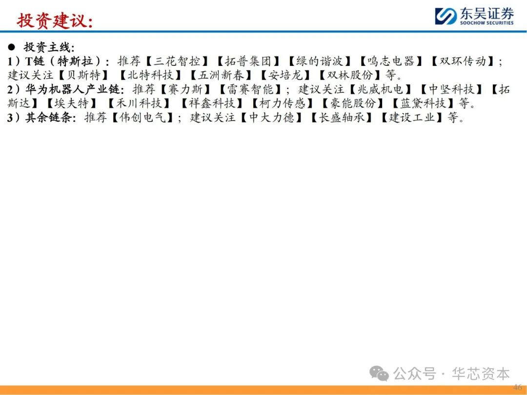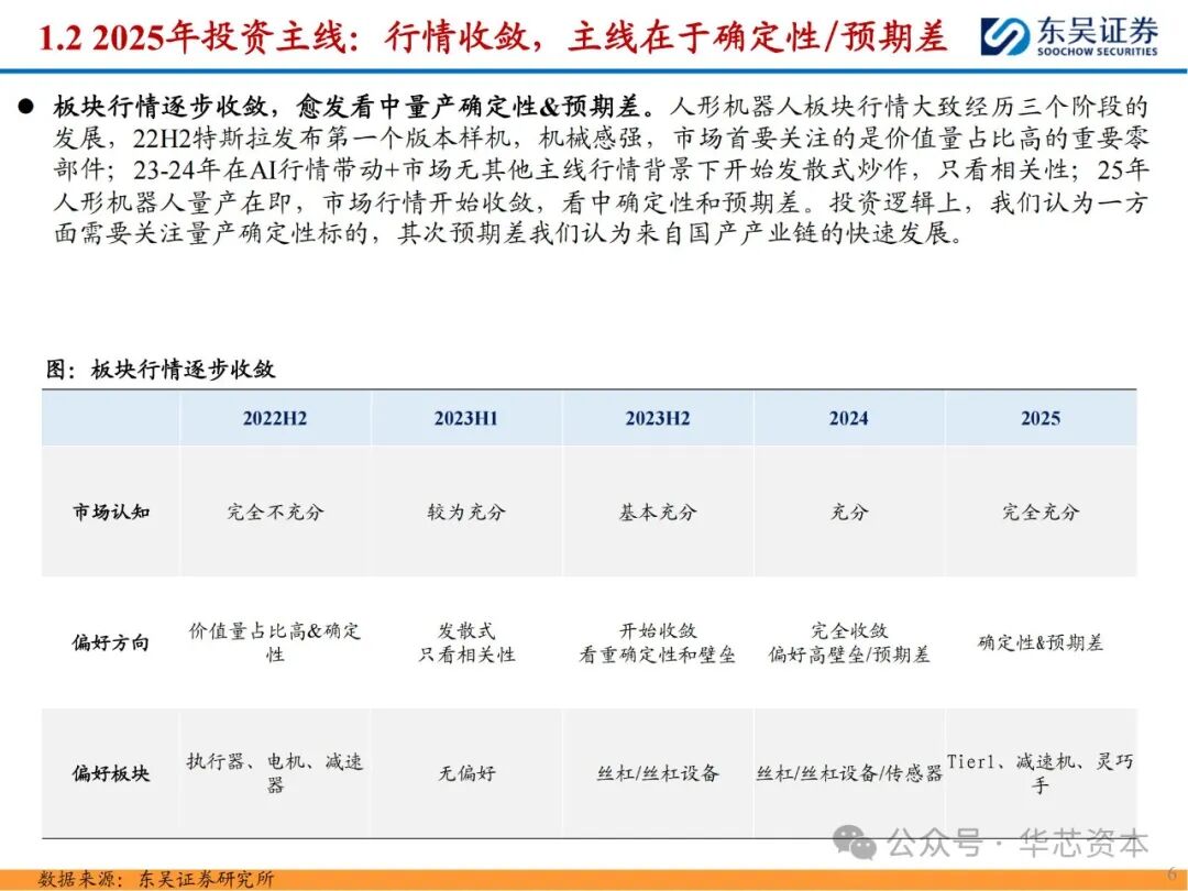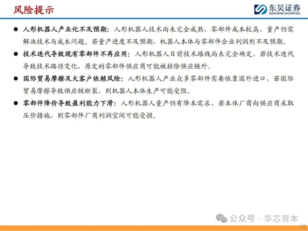 关注华芯资本公众号并发送“人形机器人”可获得PDF报告《人形机器人行业2025年度策略:人工智能的终极载体,量产在即开启十年产业大周期》。Q1:人形机器人行业当前的核心发展趋势是什么?A1:行业正迈向量产化与智能化新阶段,AI技术成为关键驱动力。1)量产化加速:特斯拉Optimus预计2025年产量达千台级别,2026年或增至5-10万台,2030年全球新能源汽车工厂需求或达50万台。2)AI赋能通用性:以ChatGPT为代表的端到端大模型技术,解决了人形机器人自主决策和环境适应的难题,使其从单一场景向通用场景突破。3)产业链分工明确:特斯拉(T链)和华为领衔国内产业链,核心零部件(如谐波减速器、灵巧手)成为竞争焦点。Q2:特斯拉Optimus的量产进展如何?哪些环节最具投资确定性?A2:特斯拉Optimus迭代迅速,硬件成熟度显著提升。量产规划:2025年产量预计达千台,2026年目标扩产至5-10万台,2027年或突破50万台。核心供应链:1)Tier1供应商:三花智控(热管理)、拓普集团(底盘结构)绑定特斯拉,确定性最高。2)谐波减速器:绿的谐波(国产龙头)和哈默纳科(日本巨头)占据主导,国产替代加速。3)灵巧手:短期内以外资为主,长期关注兆威机电、鸣志电器等国产替代机会。Q3:谐波减速器为何是人形机器人的关键技术?国产企业有何优势?A3:谐波减速器因体积小、精度高,成为人形机器人旋转关节的首选。1)技术难点:需解决棘轮效应、共振现象及减重问题,量产依赖工艺经验(如柔轮装配)。2)竞争格局:哈默纳科全球市占率38%,但扩产缓慢;绿的谐波(市占率26%)凭借成本优势(价格低30%)和快速扩产能力(目标产能100万台/年),有望抢占份额。3)国产替代逻辑:环保限制和人力成本使日本扩产困难,中国产业链成本低、响应快。Q4:华为如何布局人形机器人产业链?哪些领域值得关注?A4:华为以“大模型+算力”为核心,推动具身智能落地。技术布局:1)盘古大模型提供AI决策能力,异腾芯片支撑算力需求。2)与兆威机电(微型传动)、拓斯达(工业机器人)等16家企业合作,加速技术外溢。投资主线:1)整机制造:关注拓斯达、埃夫特等与华为联创的智能工作站项目。2)核心零部件:兆威机电(灵巧手传动)、禾川科技(伺服系统)有望受益。3)潜力场景:汽车工厂(质检/总装)、家庭服务(端茶倒水)为初期落地方向。Q5:人形机器人市场空间有多大?哪些应用场景将率先爆发?A5:汽车工厂是短期核心场景,长期向服务业扩展。市场测算:1)2030年特斯拉工厂需求12.5万台,全球新能源汽车工厂需求50万台。2)谐波减速器市场规模或达751亿元(2035年),灵巧手电机市场618亿元。场景优先级:1)汽车制造:总装环节自动化率仅10%,人形机器人可替代人工安装、质检。2)物流与零售:轮式机器人(成本低)优先切入C端配送、仓储管理。3)家庭服务:需等待AI交互和安全性技术成熟,预计2030年后放量。Q6:投资该行业需警惕哪些风险?A6:三大风险需重点关注:1)技术迭代风险:灵巧手、传感器等技术路线未定型,现有供应商可能被替代。2)量产不及预期:核心零部件(如行星滚柱丝杠)加工难度高,或拖累降本进度。3)地缘政治风险:中美贸易摩擦或影响芯片、精密部件供应链稳定性。结语人形机器人行业正处于“硬件迭代+AI突破”的关键节点,特斯拉与华为分别引领全球和国内产业链发展。投资者需聚焦高确定性环节(T链、谐波减速器),同时关注华为链的预期差机会。短期看汽车工厂落地,长期押注通用场景突破,但需警惕技术路径变化与国际局势波动带来的不确定性。/END/最近我们要组织一系列关于【AI、半导体、新材料】闭门会议,有兴趣的同学,非常欢迎和我们多多交流,互相探讨,一起成长(华芯资本梁东健,VX:sinbaliang)。