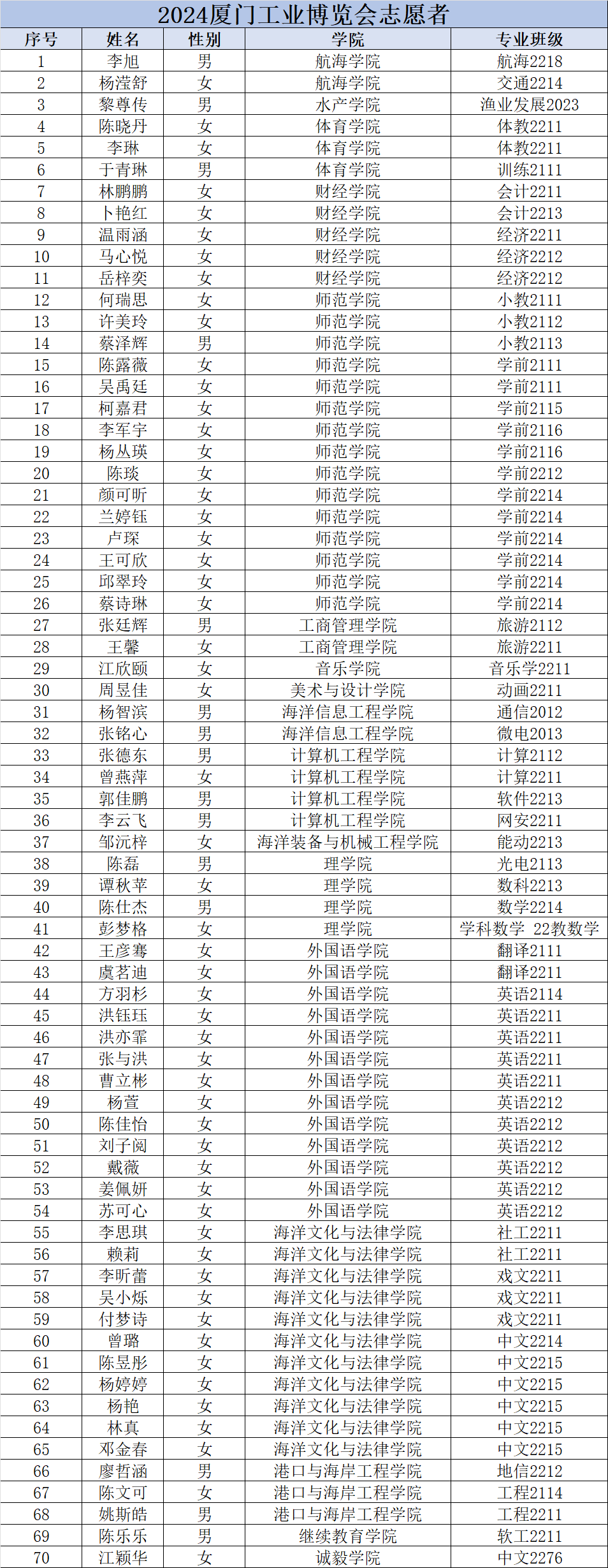 2024年厦门工业博览会志愿者招募已圆满结束,感谢同学们的积极参与!经过校青协遴选,现将志愿者名单予以公布:预祝2024厦门工业博览会顺利举办!平台编辑 | 洪钰涵 林怡婧责任编辑 | 颜书妤 庄汝昕编审 | 陈文彪