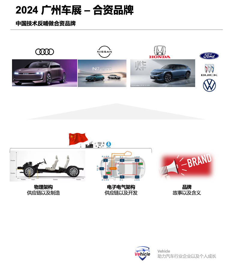 以上为本次广州车展上采用本土架构的合资品牌,当然他们应该将物理架构和电子电气架构融合,其中物理架构在现在已经是简单变成制造和供应链的集成管理,电子电气架构是合资缺的东西,外方在产品和技术方面最后的倔强,但在销量极速下跌的时候,谁也没有了倔强。