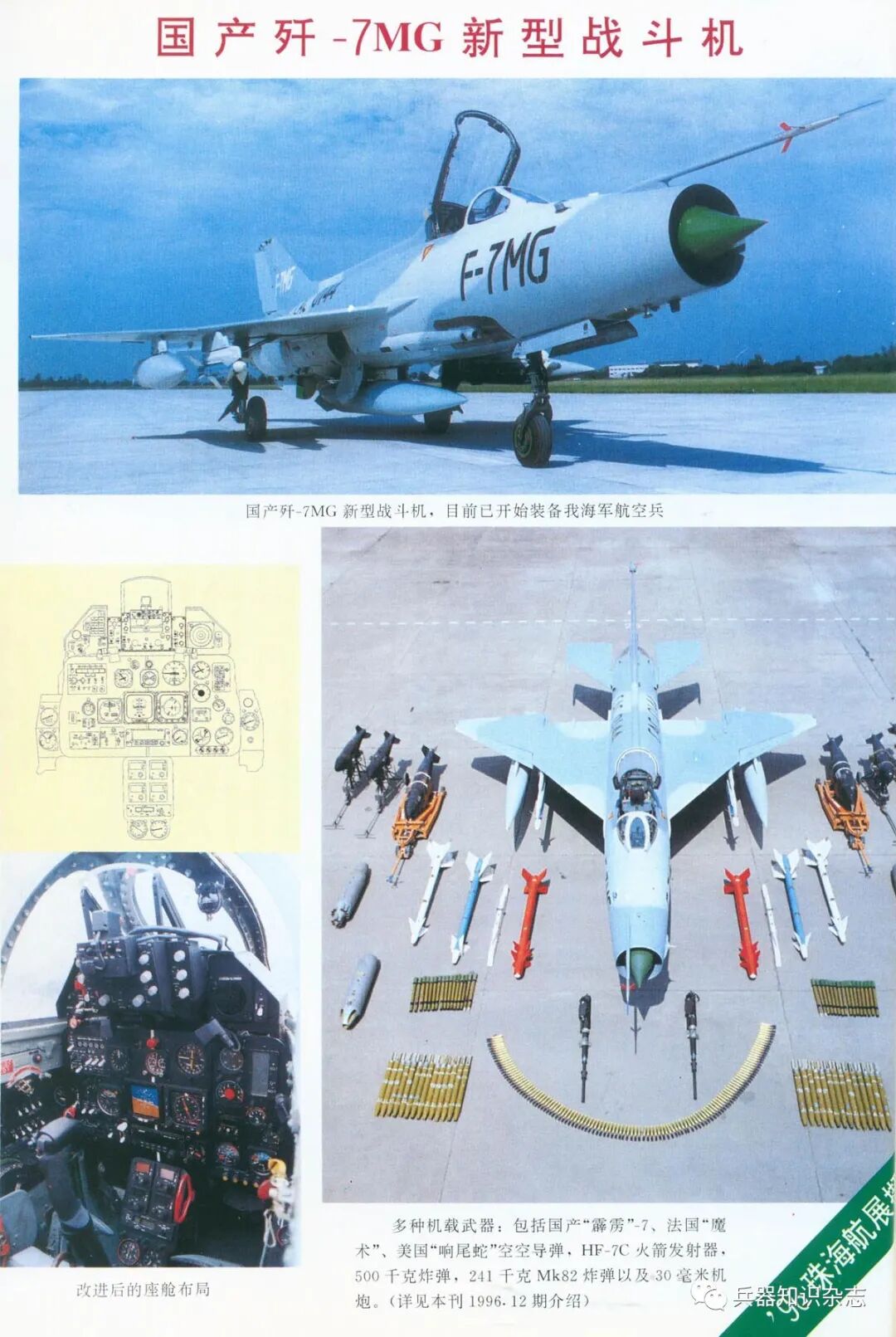 在场工作人员向记者介绍,在歼7MG与苏-27进行的模拟空战中,歼7MG曾多次“击落”苏-27,由此可见其机动性能之优越。此外,升力加大还使飞机的起飞滑跑距离从以往的1 000米降至600米左右。值得一提的是,歼7MG的机载电子设备也大为改进,最主要的是加装了SSR火控雷达,以代替原有的测距雷达。SSR是一种低成本的多功能雷达,具有下视/下射能力,不仅可测量目标距离,还可对目标实施跟踪,并使飞机夜战能力得以改善。此外,该雷达还使歼7MG具备了对地攻击的能力。飞机座舱设备方面,采用多功能显示器代替部分传统仪表盘,从而降低了飞行员的工作负荷。机载武器方面,歼7MG装有两门30毫米航炮,机上共有5个外挂点,可挂国产“霹雳”系列空空导弹、法国“魔术”及美国AIM9P“响尾蛇”导弹。对地武器包括Mk82炸弹及各型火箭弹等。此外,歼7MG还装有GPS全球定位系统和军、民两种的导航系统,能在民用机场起降。