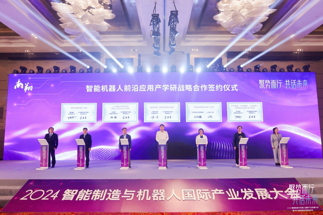 智能制造与机器人国际联创中心成立以来,致力于促进领域内的产学研合作,深度联合高校、科研机构、产业代表等优势企事业单位进行务实的交流与研发交付,借此契机,iRIC智能制造与机器人国际联创中心推动智能机器人前沿应用产学研战略项目签署与合作,现场中心院长袁建军教授携手上海大学鲍晟教授与上海建工集团投资有限公司投资总监李一为 、中石油川庆安检院技术开发部部长王仕强、苏州宝韵精密机电有限公司总经理张桂香、上海泽泉科技股份有限公司总经理顾群、重庆墨菲科技有限公司总经理毛彦军共同上台签署项目合作、共同推进建筑机器人领域研发转化项目、智能防爆巡检机器人项目、关节模组、车轮模组、人形机器人研发及孵化合作项目、人工智能实验室项目、机器人实训分中心项目、探伤打磨机器人项目等多个智能机器人前沿应用产学研的落地。
