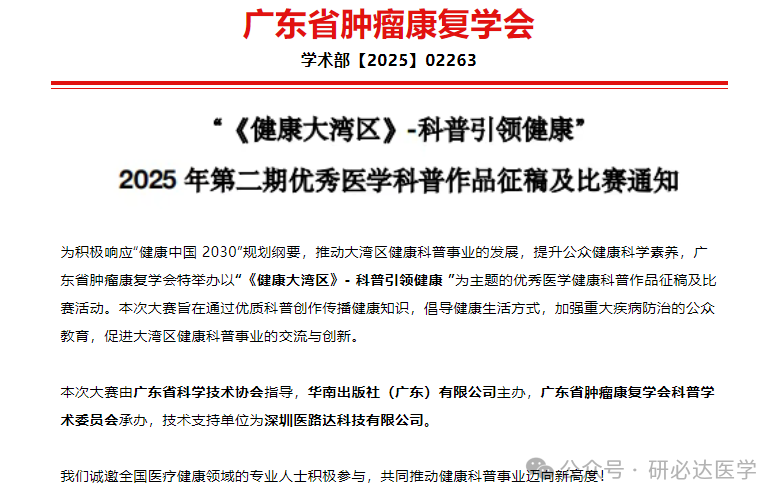 - 评审与收录:作品经专家组评定后,择优发布于广东省肿瘤康复学会科普平台及中国知网数据库。