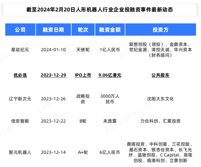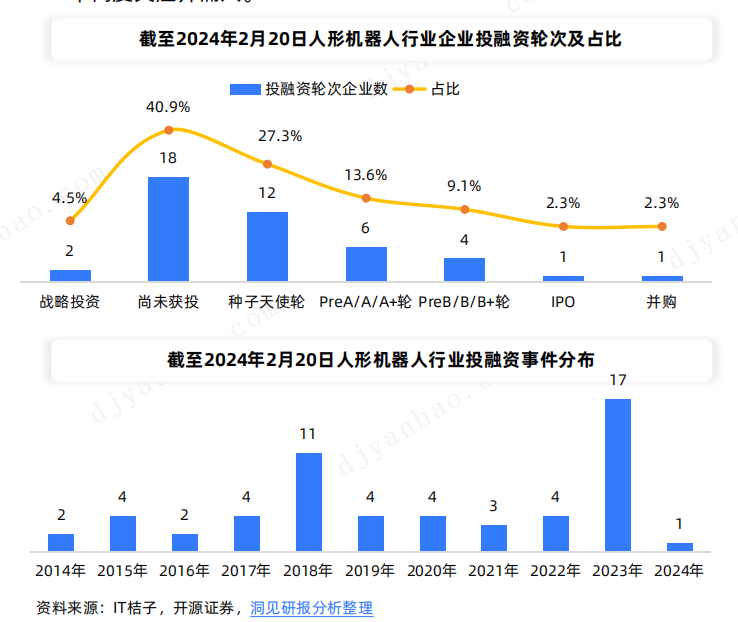 2023年人形机器人企业的投融资多数处于初期轮次,证明该行业处于发展初期。从投融资事件分布来看,2023年出现行业投融资小高峰,资本高度关注并涌入。
