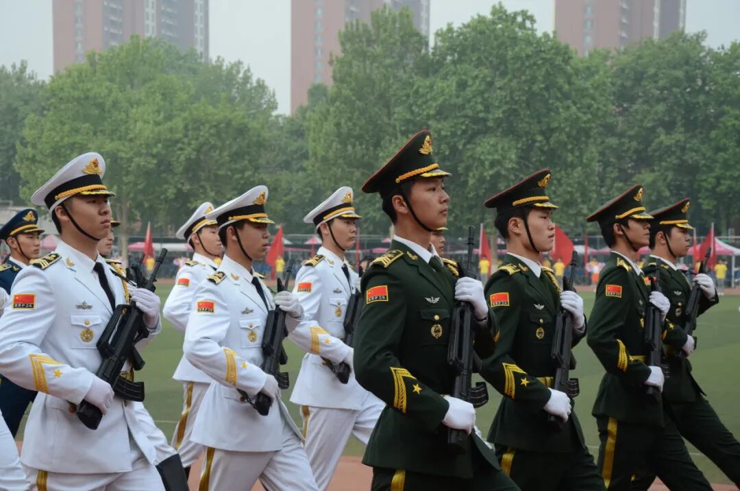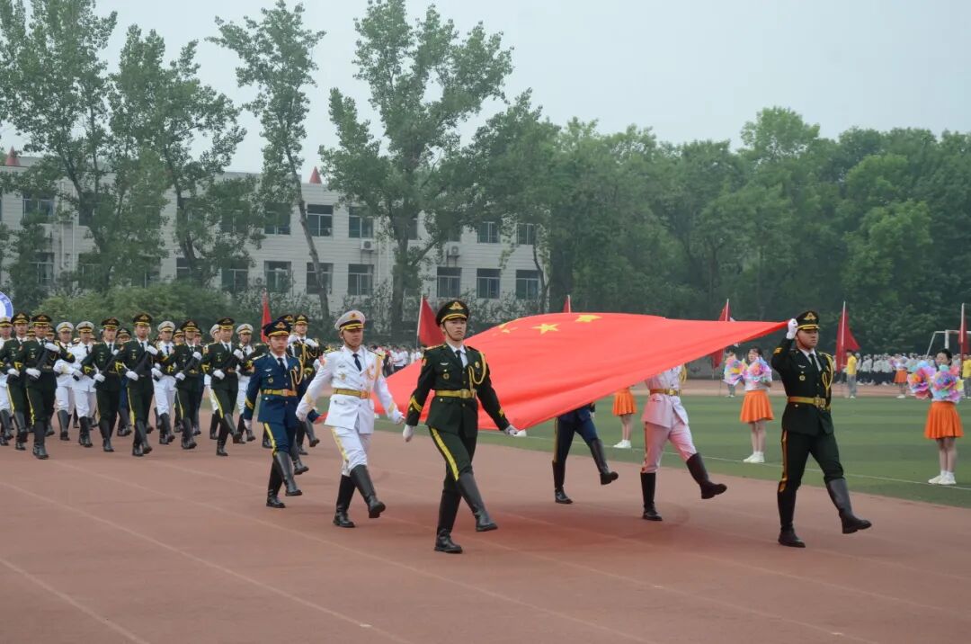 运动场上,一面红旗迎风飘扬,整齐的国旗护卫队护送着国旗入场。