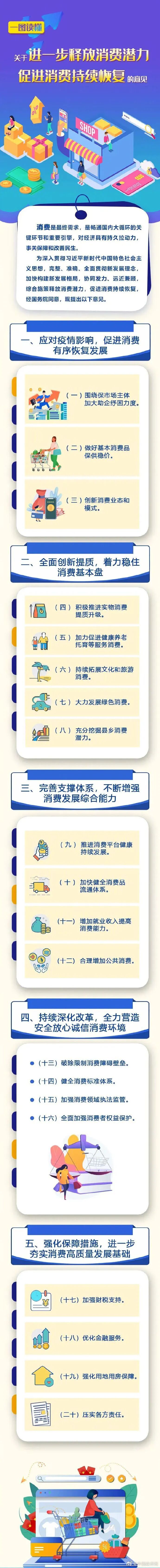 《意见》指出,消费是最终需求,是畅通国内大循环的关键环节和重要引擎,对经济具有持久拉动力,事关保障和改善民生。为深入贯彻习近平新时代中国特色社会主义思想,完整、准确、全面贯彻新发展理念,加快构建新发展格局,协同发力、远近兼顾,综合施策释放消费潜力,促进消费持续恢复,《意见》按照目标导向和问题导向相结合、短期支持和中长期促进相兼顾的要求,提出了五方面二十项重点举措。一是应对疫情影响,促进消费有序恢复发展。围绕保市场主体加大助企纾困力度,做好基本消费品保供稳价,创新消费业态和模式。二是全面创新提质,着力稳住消费基本盘。积极推进实物消费提质升级,加力促进健康养老托育等服务消费,持续拓展文化和旅游消费,大力发展绿色消费,充分挖掘县乡消费潜力。三是完善支撑体系,不断增强消费发展综合能力。推进消费平台健康持续发展,加快健全消费品流通体系,增加就业收入提高消费能力,合理增加公共消费。四是持续深化改革,全力营造安全放心诚信消费环境。破除限制消费障碍壁垒,健全消费标准体系,加强消费领域执法监管,全面加强消费者权益保护。五是强化保障措施,进一步夯实消费高质量发展基础。加强财税支持,优化金融服务,强化用地用房保障,压实各方责任。