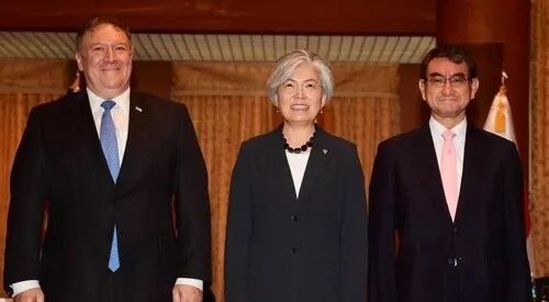 △美国国务卿蓬佩奥(左)韩国外长康京和(中)日本外相河野太郎(右)/资料图