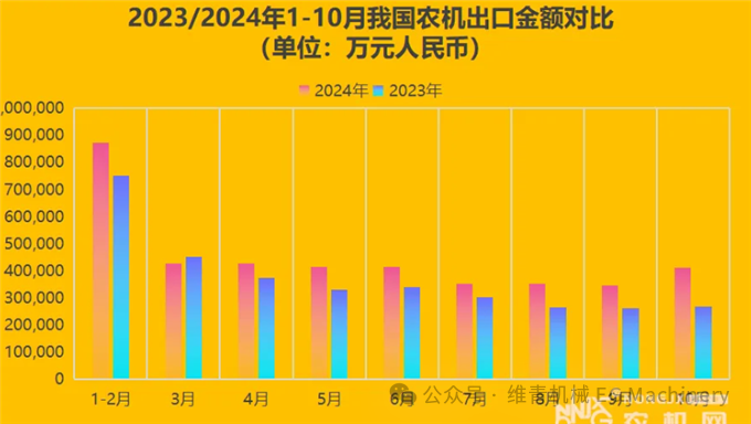 2024年10月,我国农业机械当月出口金额为410,088万元,比去年同期增长53.6%;1-10月累计出口金额为4,010,806万元,比去年同期增长21.4%。