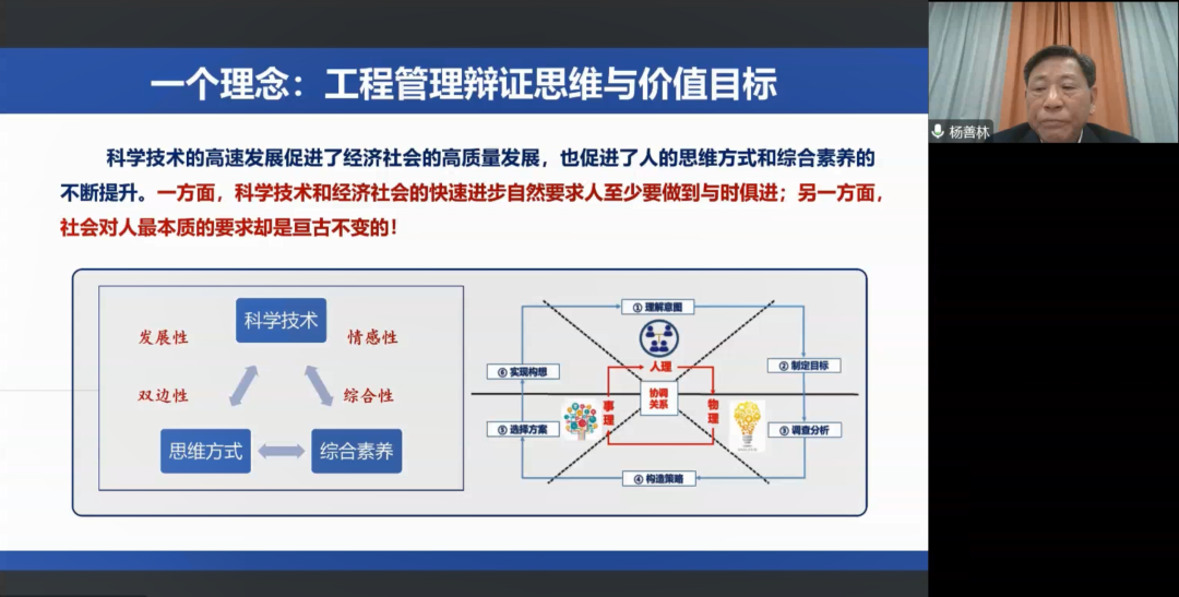 中国工程院院士、合肥工业大学杨善林教授在“人工智能与工程管理”的主题报告中,以“智能网联汽车变革与管理创新”的案例引入,分享“人工智能与领域科学互动发展”的观点,并阐述“工程管理辩证思维与价值目标”的理念。他指出,新一代信息技术与管理融合衍生“新管理”概念,基于数据的人工智能必将对管理产生颠覆性变革,而管理必将引领人工智能的发展。科学合理的重大工程管理应当从战略统筹的高度整合工程实践的自然、社会、经济、科技、人才、文化等多元价值目标。