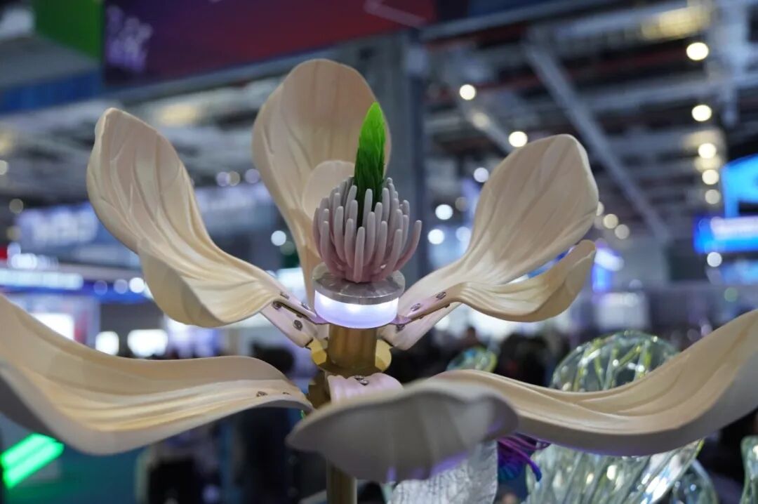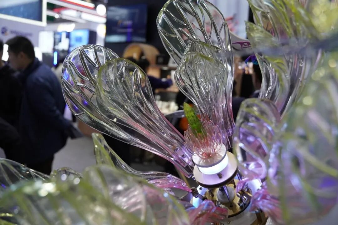 开合花装置是展会上较为吸睛的亮点,这个造型婀娜多姿的艺术装置集合了多项3D打印技术和后处理工艺,花朵部分采用光固化工艺成型,表面做染色、喷漆等处理,蝴蝶采用金属3D打印工艺,表面做阳极氧化处理。花心采用Polyjet打印成型,十分生动。
