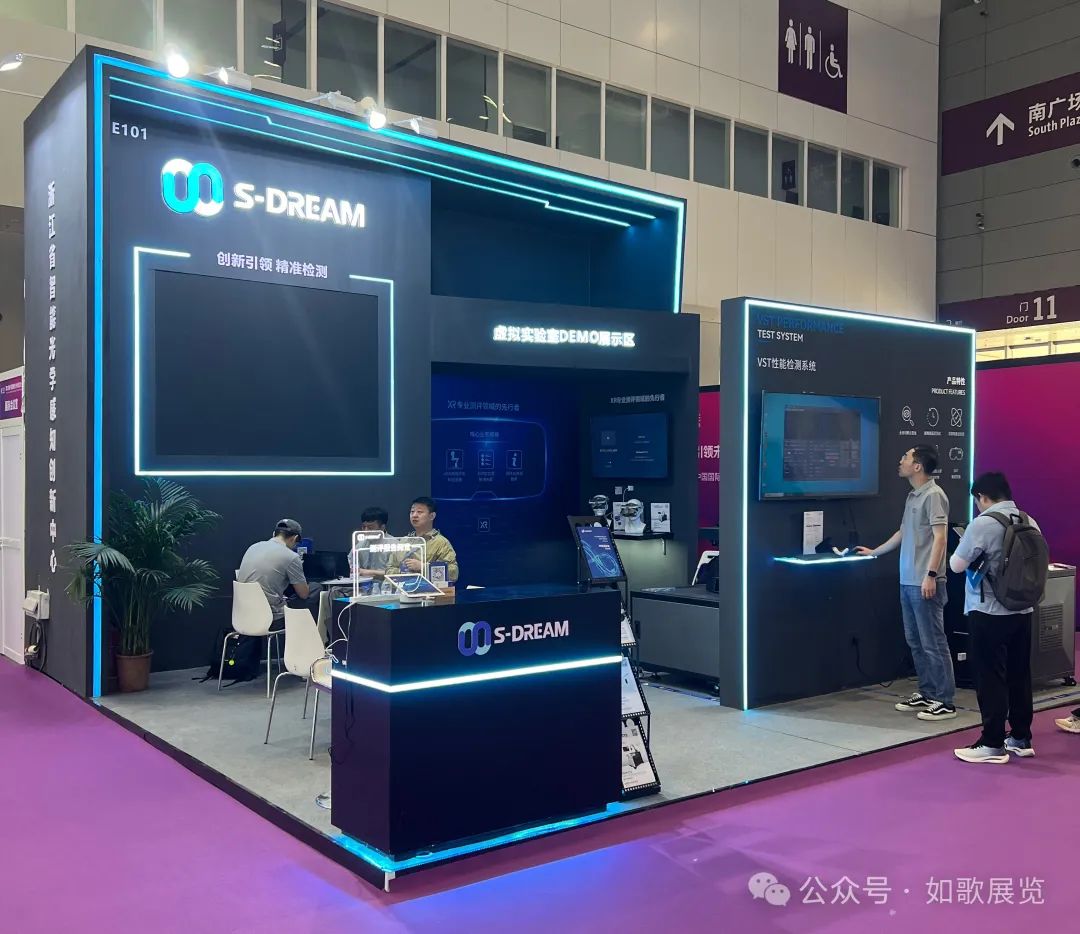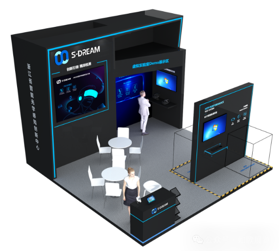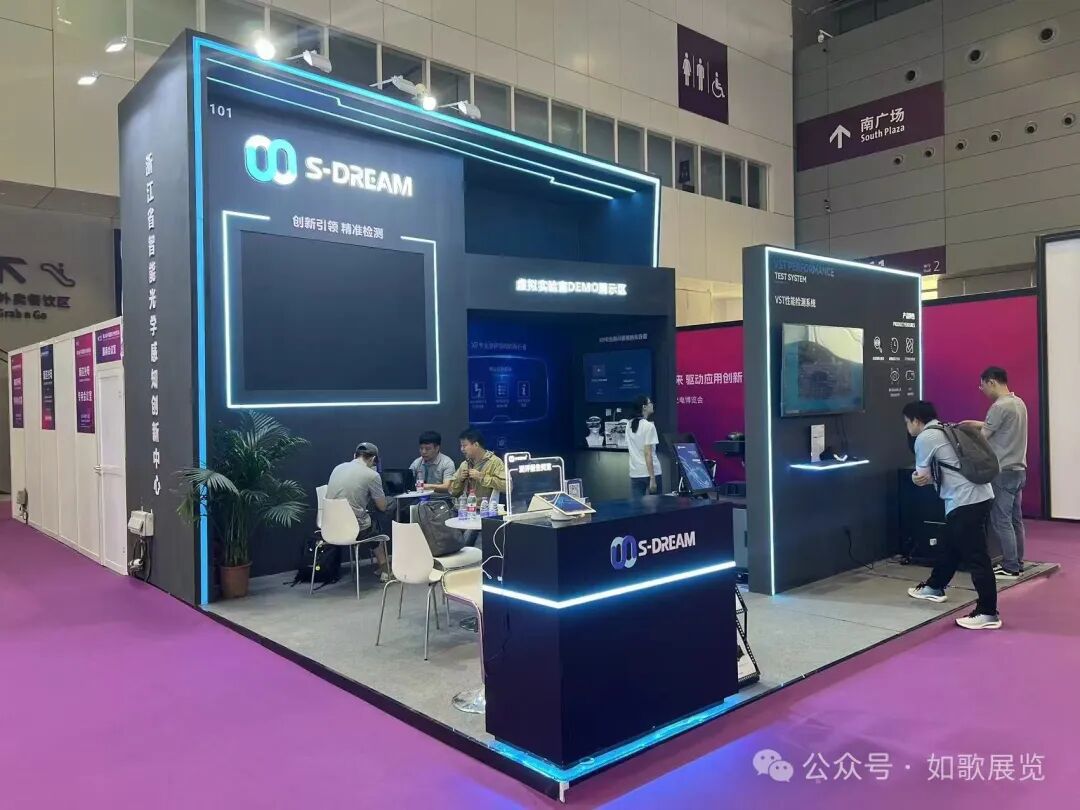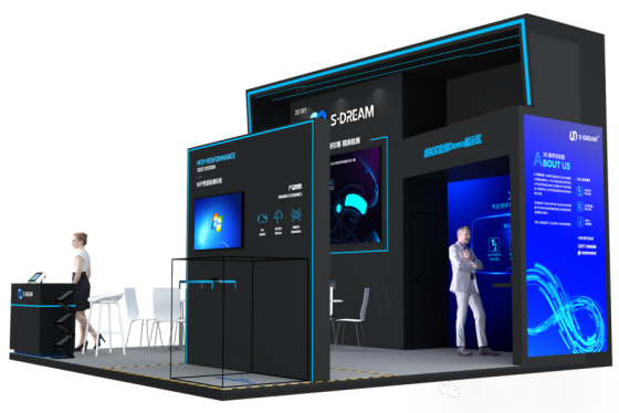 在此次光博会上,S-Dream的展台由如歌展览全权设计搭建。该展位的设计理念突出科技感,运用大量直线条和几何形状,营造出严谨高效的氛围,契合智能光学等高科技领域的特质。在色彩搭配上,主色调黑色沉稳高端,辅助色调蓝色提亮空间并起到点缀作用,既增强了科技氛围,又使整体设计灵动而富有活力;蓝色线条还起到了引导视线的作用。