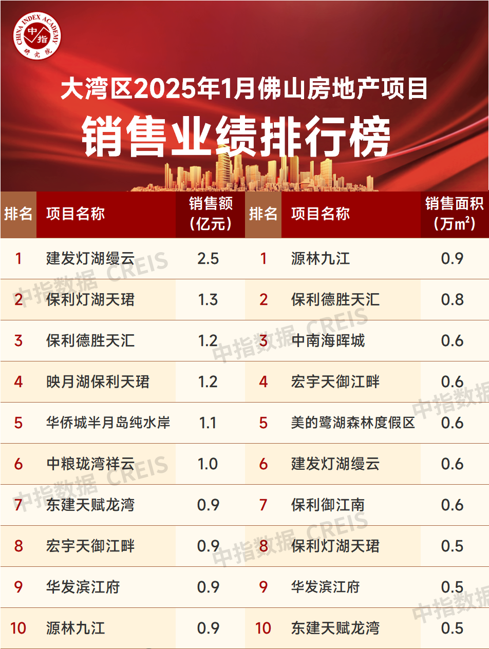 特别声明:房地产企业销售数据统计是以2025年1月1日-1月27日期间销售的商品房为统计口径,1月28日-1月31日数据为预估值,包括商品住宅、写字楼、公寓、商业全口径,主要依据中指数据CREIS(点击查看)在佛山市域范围的销售监测数据,并参考当期总体经营情况和推盘去化情况进行分析统计;对于少数没有在监测范围内的企业和项目,由企业提供相关文件,经审核,也纳入统计范围。本报告仅供参考,不对使用报告及其内容所引发的任何直接或间接损失承担责任。