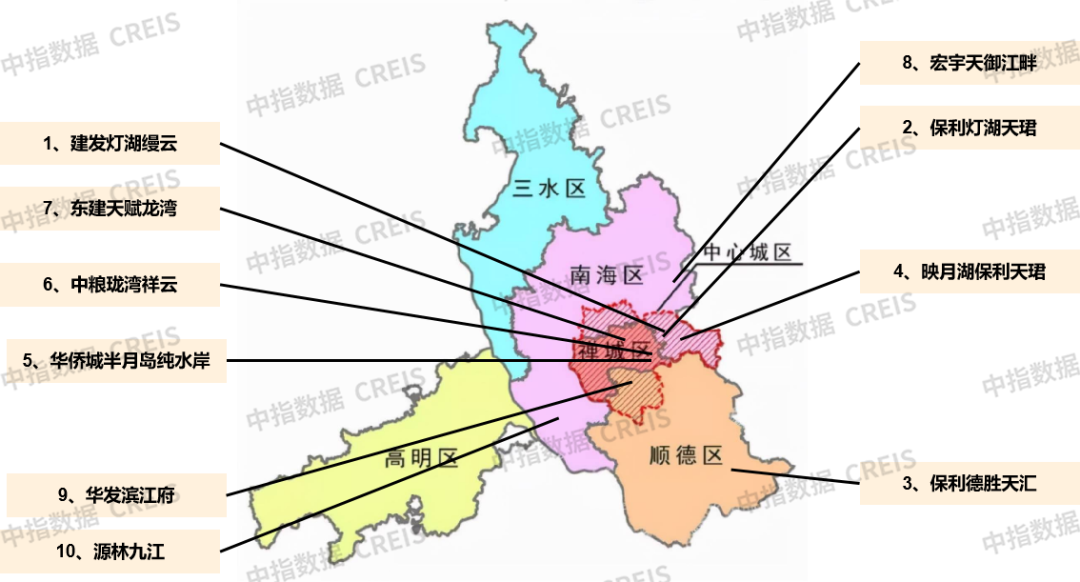 各区分布:TOP10项目销售额榜单中,南海区最多,共5个项目上榜,主要集中在千灯湖周边,部分分布于里水、九江。禅城区3个项目上榜,分别位于祖庙板块以及张槎板块。顺德区2个楼盘上榜,其中1个位于大良、1个位于佛山新城。