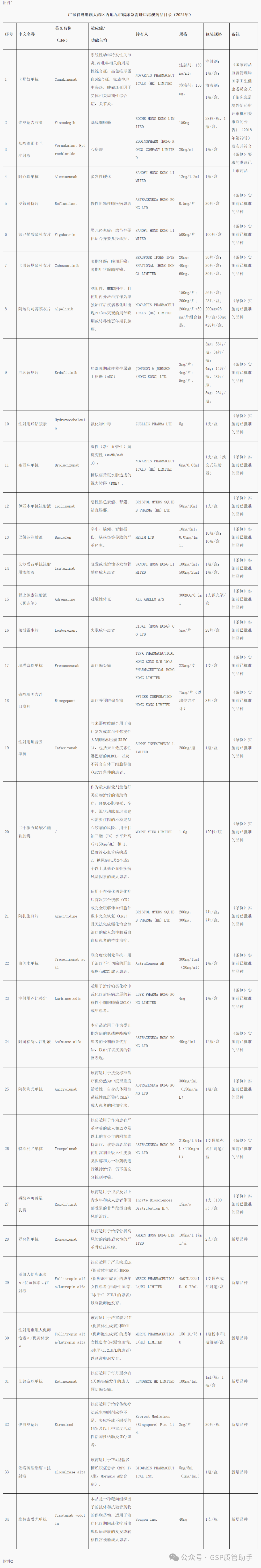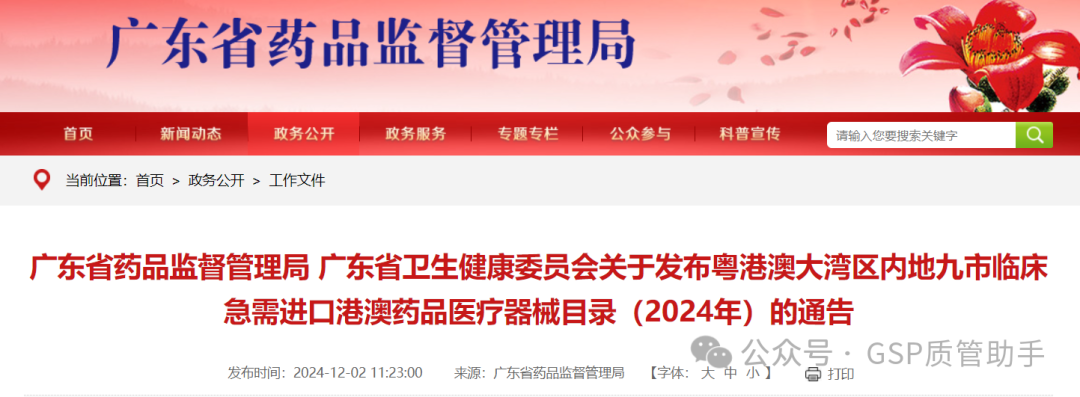 根据《广东省粤港澳大湾区内地九市进口港澳药品医疗器械管理条例》(以下简称《条例》)中对急需港澳药械实施目录管理的要求,广东省药品监督管理局、广东省卫生健康委员会经研究决定发布广东省粤港澳大湾区内地九市临床急需港澳药品医疗器械目录(2024年)。本批目录将按《国家药品监督管理局国家卫生健康委员会关于临床急需境外新药审评审批相关事宜的公告》(2018年第79号)发布并符合《条例》要求的港澳已上市药品及《条例》实施前已批准的共71个药品及医疗器械收录。对已列入目录的药械产品,将于2024年12月1日起按照《条例》第九条进行管理。 特此通告。 附件:1.广东省粤港澳大湾区内地九市临床急需进口港澳药品目录(2024年) 2.广东省粤港澳大湾区内地九市临床急需进口港澳医疗器械目录(2024年) 广东省药品监督管理局 广东省卫生健康委员会2024年11月29日