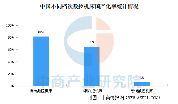 当前我国中、低端数控机床的国产化率分别为65%、82%,高端数控机床的国产化率仅6%,高端数控机床存在着较大的国产化空间。
