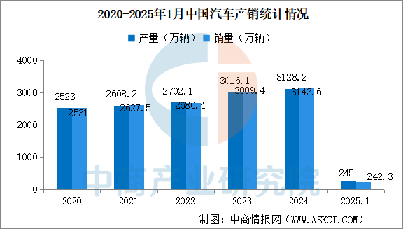 2024年,汽车产销分别完成3128.2万辆和3143.6万辆,同比分别增长3.7%和4.5%。2025年1月,汽车产销分别完成245万辆和242.3万辆,产量同比增长1.7%,销量同比下降0.6%。