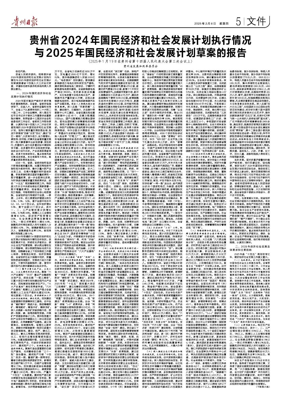 贵州省2024年国民经济和社会发展计划执行情况与2025年国民经济和社会发展计划草案的报告(2025年1月19日在贵州省第十四届人民代表大会第三次会议上) 贵州省发展和改革委员会各位代表: 受省人民政府委托,现将贵州省2024年国民经济和社会发展计划执行情况与2025年国民经济和社会发展计划草案提请省十四届人大三次会议审查,并请各位政协委员和其他列席人员提出意见。 一、2024年国民经济和社会发展计划执行情况 2024年面对复杂严峻的外部环境和多重困难挑战,在省委、省政府坚强领导下,在省人大、省政协监督和支持下,全省上下认真贯彻党的二十大和二十届二中、三中全会精神,深入落实习近平总书记关于贵州工作重要讲话重要指示精神,按照省委十三届历次全会和省委经济工作会议、省政府工作报告部署,认真执行省十四届人大二次会议审查批准的2024年国民经济和社会发展计划,坚持以高质量发展统揽全局,坚定不移围绕“四新”主攻“四化”、建设“四区一高地”,以改革为动力,全力稳增长、调结构、防风险,对事关全省高质量发展的一批大事要事作出系统部署,顶压前行、负重前行,奋力在多重目标中做到科学平衡、在多重约束中实现有效突破,经济运行回升向好,产业发展取得新突破,改革开放持续深化,重点领域风险化解成效明显,民生保障有力有效,高质量发展取得明显成效。 过去一年,省委、省政府始终坚定不移推动高质量发展、注重发挥有效市场和有为政府作用、集中力量大抓产业主攻工业、在做大增量的同时盘活存量,积极承接和落实国家存量政策和一揽子增量政策,进一步全面深化改革,与时俱进完善高质量发展政策体系,启动“十五五”规划编制前期工作。特别是9月26日中央政治局会议果断部署一揽子增量政策后,我省推出“36条”加力措施,市场预期和社会信心有效提振,全省经济运行持续好于全国,一季度、上半年、前三季度经济增速分别为5.5%、5.3%、5.2%,高于全国平均水平0.2、0.3、0.4个百分点;全年经济增长5.3%,高于全国0.3个百分点,其中一、二、三产业增加值分别增长3.8%、6.7%和4.8%;规模以上工业增加值增长8.2%;固定资产投资增长0.6%,社会消费品零售总额增长3.7%;一般公共预算收入增长4.4%,城镇和农村常住居民人均可支配收入分别增长4.2%、7%;城镇新增就业62.51万人,城镇调查失业率5.3%;居民消费价格指数上涨0.1%。 2024年明确的54项国民经济和社会发展计划指标执行情况总体良好。受有效需求不足、财政收支矛盾突出、部分企业生产经营困难、群众就业增收压力大等影响,部分预期性指标完成不及预期,但随着全省上下加快推动工作重心转移、思想观念转变、经济发展转型,全省经济社会大局稳中向好,质量结构效益持续提升,发展动力活力不断迸发,干部作风面貌焕然一新,谱写中国式现代化贵州篇章迈出坚实步伐。 (一)集中力量大抓产业、主攻工业,工业支撑作用更加凸显。聚焦“六大产业基地”“3533”重点产业集群和主导产业,滚动实施“一图三清单”,以重大项目为牵引加快建设现代化产业体系,因地制宜培育新质生产力。“六大产业基地”建设取得新突破。“六大产业基地”规模以上工业总产值占全省规模以上工业总产值的比重达82.1%、同比提高1个百分点。资源精深加工产业加快延链强链、耦合发展。加快建设全国重要的资源精深加工基地,召开全省“富矿精开”推进大会,推动精确探矿、精准配矿、精细开矿、精深用矿。深入实施新一轮找矿突破战略行动,探获一批煤、磷、铝等战略性资源。开展矿产资源条例修订工作。贵州投资最大的产业项目毕节磷煤化工一体化项目启动建设,永荣磷氟煤产业基地、盛义信煤焦化、裕能铜冶炼、瓮福江山新材料、美锦华宇煤焦氢等一批百亿级重大项目接续落地、建设、投产,磷化工、煤化工、氟化工等耦合发展成效明显,化工、有色行业增加值增速均超过30%。注重延链强链补链,立足比较优势发展特色产业,引进纺织服装项目24个、建成投产17个。酒烟煤电基本盘保持稳定。聚焦打造全国重要的白酒生产基地,完成酱香型白酒“三个一批”综合整治,建成投产习酒“十四五”技改一期、董酒扩建一期等项目,酱香白酒全国标准获国家发布,新增优质白酒产能5万千升,白酒产业增加值增长7.5%。加快建设新型综合能源基地和西南地区煤炭保供中心,调度原煤产量达1.68亿吨、增长9.8%,产量为“十四五”以来最高。建成投产盘江新光燃煤发电项目超超临界2号机组、黔中电厂超超临界1号机组,积极谋划推动清洁能源入黔和打造西南区域电力枢纽,新增风电、光伏等新能源装机477万千瓦,全省电力总装机达9200万千瓦,发电量达2600亿千瓦时、增长8.2%,贵州能源集团收入突破1000亿元。“电动贵州”加快建设。围绕建设新能源动力电池及材料研发生产基地,建成贵阳弗迪电池二期项目、宁德时代新能源电池贵州基地,全省新能源电池产能达38GWh;吉利新车型实现量产,长江电动重卡实现本地化生产,新能源汽车产量突破10万辆,实现从新能源电池材料、动力电池到新能源汽车全产业链发展。抢抓人工智能机遇打造智算集群。深入实施“东数西算”工程,建设银行、交通银行、兴业银行等数据中心开工建设,全省在建及投运重点数据中心达48个,总算力规模超55Eflops,国产化智算能力规模全国领