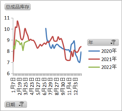 周度下游样本企业开工负荷小幅降低,环比下降1.23%,同比下降12.25%,其中软制品开工环比下降2.46%,同比下降16.34%,硬制品开工环比下降0.71%,同比下降12.05%。下游开工负荷持续走弱,周度华东地区受疫情拖累环比降负荷明显,华北、华南地区稍有恢复,整体下游开工同比处低位。原料库存小幅去库,成品库存小幅累库,整体库存低于去年同期水平,下游库存较干。订单天数小幅走弱,环比减少0.60天,整体处19.40天水平,短期内疫情对需求端的抑制作用仍存。后续关注下游恢复情况及库存走势。
