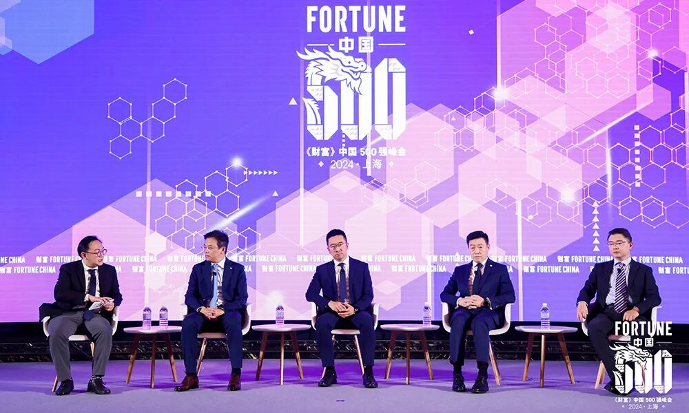 2024年《财富》中国500强峰会现场。从左至右依次为:《财富》中国新媒体执行副主编杨安琪,TCL实业控股股份有限公司副总裁、格创东智科技有限公司首席执行官何军,腾讯云副总裁、智能制造与智慧能源负责人曹磊,江森自控日立空调集团全球副总裁,中国、东南亚及太平洋大区总经理关宇,新希望集团首席数字官、新希望数科集团首席执行官李旭昶。