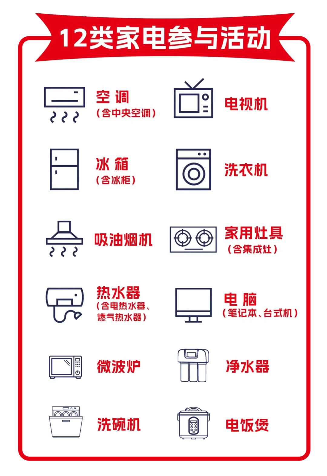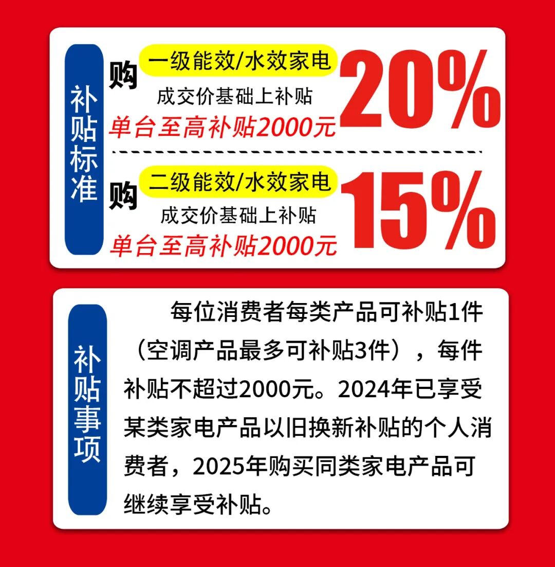 自本公告发布之日起,个人消费者在参与商家购买冰箱(含冰柜)、洗衣机(含洗烘一体机)、电视(含激光电视,不含投影仪)、空调(含家用中央空调)、电脑(品牌机,不含组装机)、热水器(含壁挂炉)、家用灶具(含集成灶)、吸油烟机、净水器(含直饮机、管线机)、微波炉(含微蒸烤一体机)、洗碗机、电饭煲(锅)等12类家电产品,对2级能效或水效标准产品按最终销售价格的15%给予补贴,对1级能效或水效标准产品按最终销售价格的20%给予补贴。每位消费者每类产品可补贴1件(空调产品最多可补贴3件),每件补贴不超过2000元。2024年已享受某类家电产品以旧换新补贴的个人消费者,2025年购买同类家电产品可继续享受补贴。