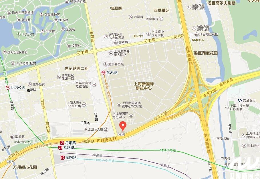 3、4 号线中山公园站, 1、8 号线人民广场站, 4、6、9 号线世纪大道站皆可换乘 2 号线,至龙阳路站下,再步行或换乘 7 号线至 SNIEC。