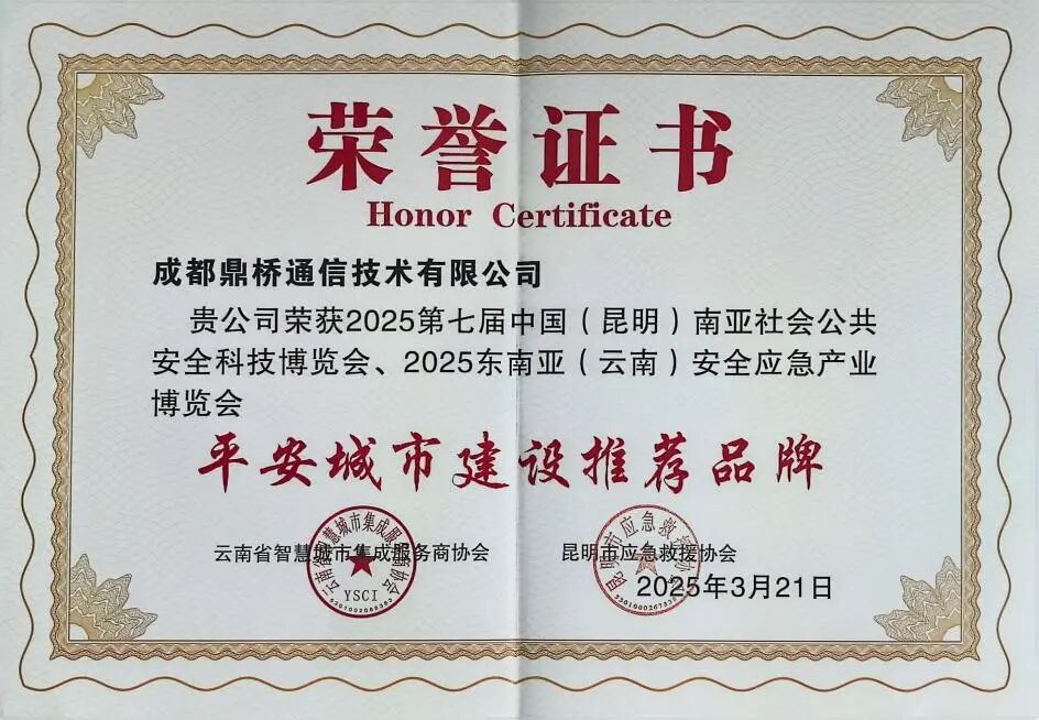 鼎桥通信荣膺大会颁发的“平安城市建设推荐品牌”称号,这一荣誉由云南省智慧城市集成服务商协会、昆明市应急救援协会联合授予,既是行业对鼎桥技术实力的认可,更是对鼎桥深耕公共安全领域的激励。