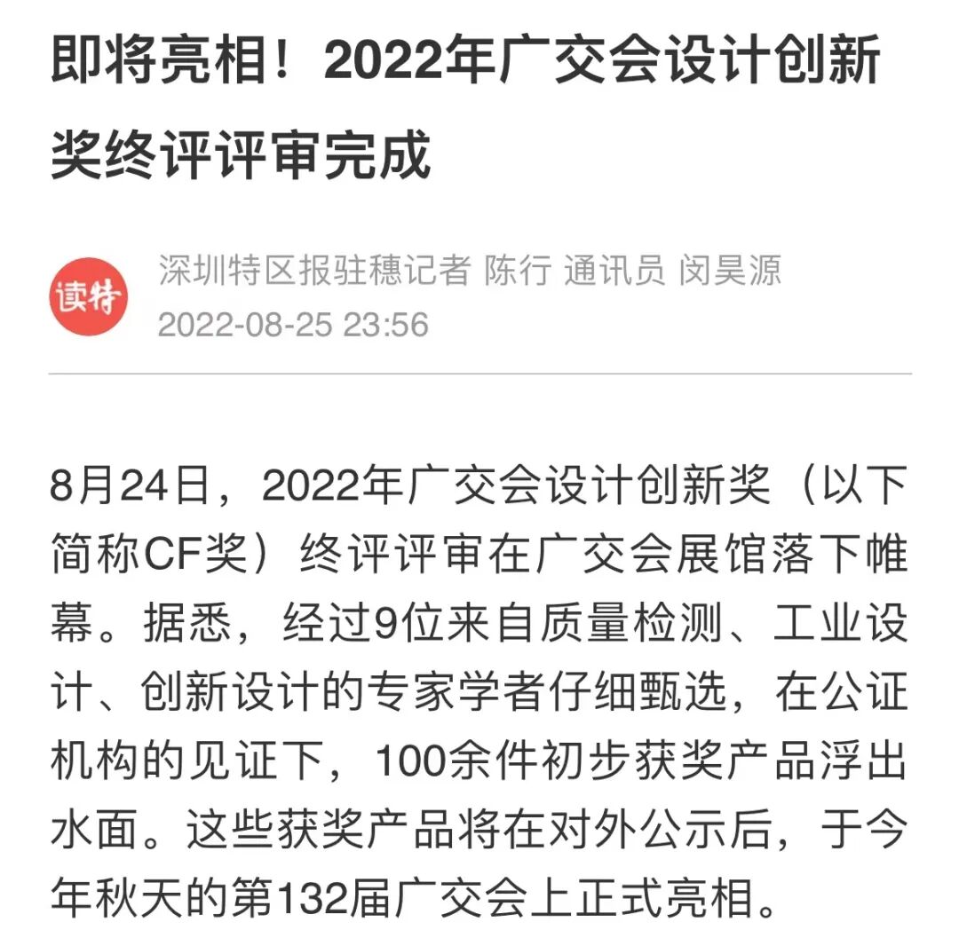 8月25日,深圳特区报刊发了《即将亮相!2022年广交会设计创新奖终评评审完成》,内容如下: