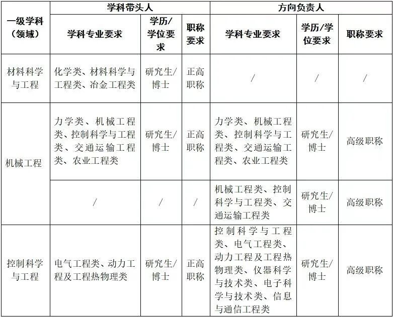 学科带头人要求正高级职称,学科方向负责人要求高级职称。具体岗位及要求详见下表,应聘人员如有特殊业绩,经学校认可,博士研究生可不受学历学位、职称、学科等条件限制。