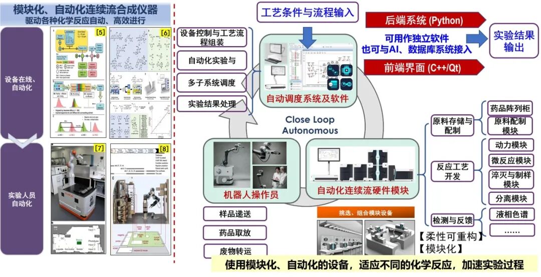 连续流技术被视为化工未来的技术,但现有研发模式存在成本高、周期长、结果不确定、过程不可控等问题,阻碍了其推广。我们团队开发了一套自动化、模块化的仪器,结合工艺算法和数据库,搭建了集成的云实验平台,能够显著降低研发成本,加速工艺开发。